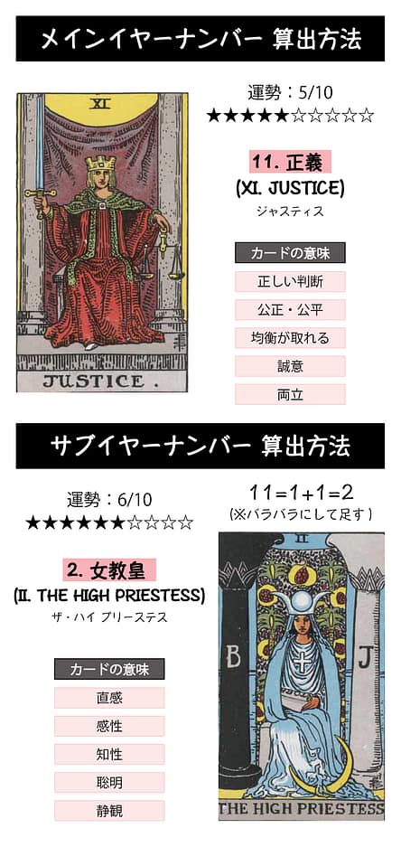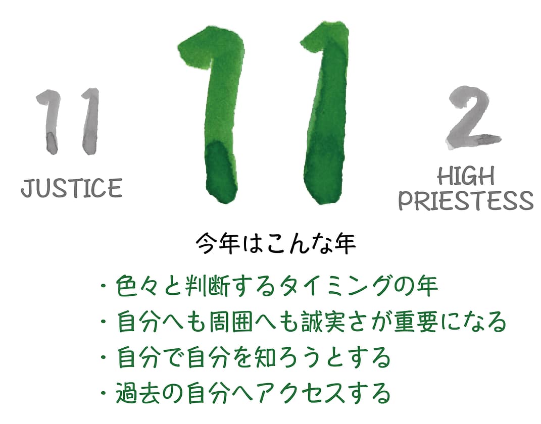 「11.正義」はバランス感覚と判断のカードのため人生のバランスを取るために色々と判断する年となり、「2.女教皇」は冷静で潜在意識が冴えているカードのため自分で自分を探す年となります。