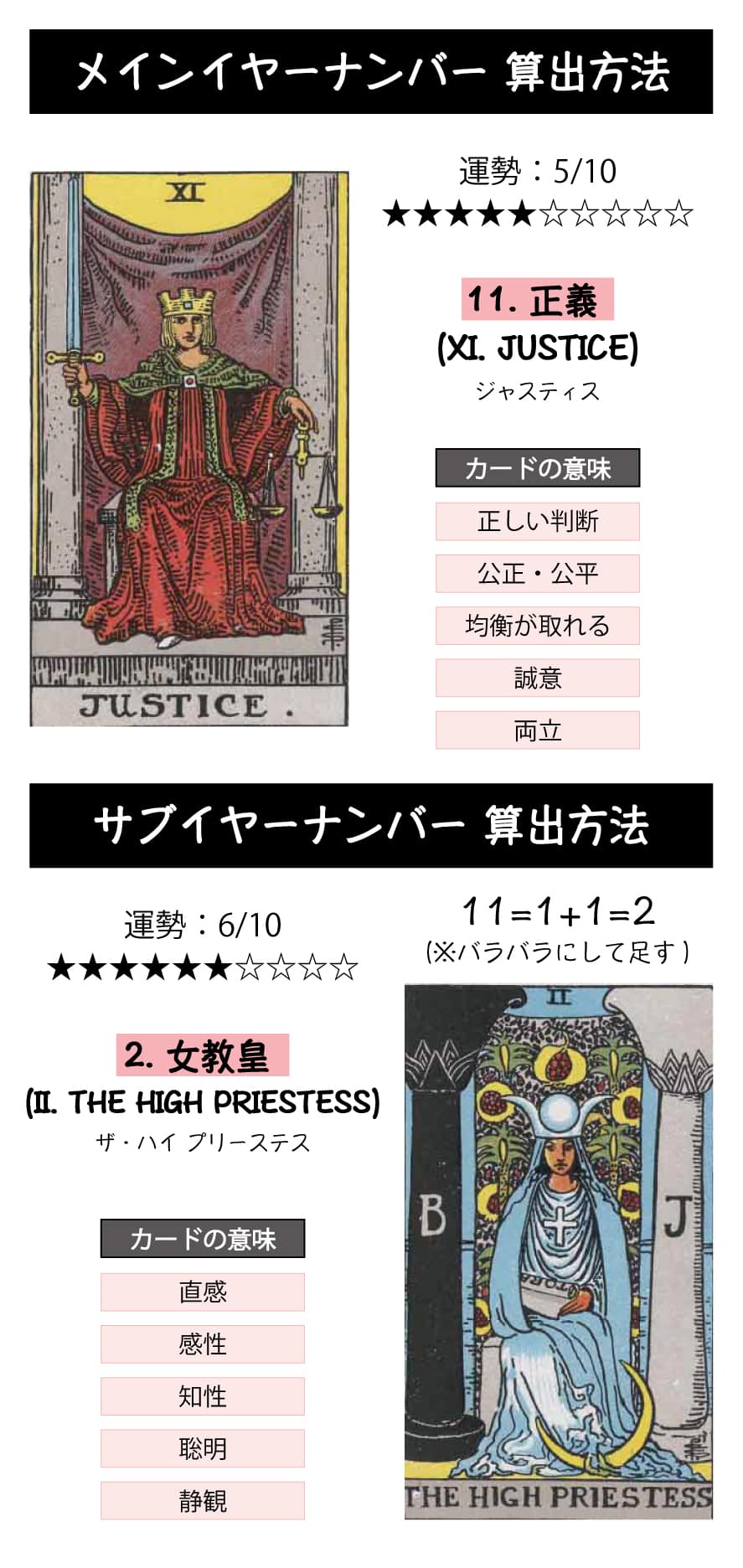 「11.正義」はバランス感覚と判断のカードのため人生のバランスを取るために色々と判断する年となり、「2.女教皇」は冷静で潜在意識が冴えているカードのため自分で自分を探す年となります。
