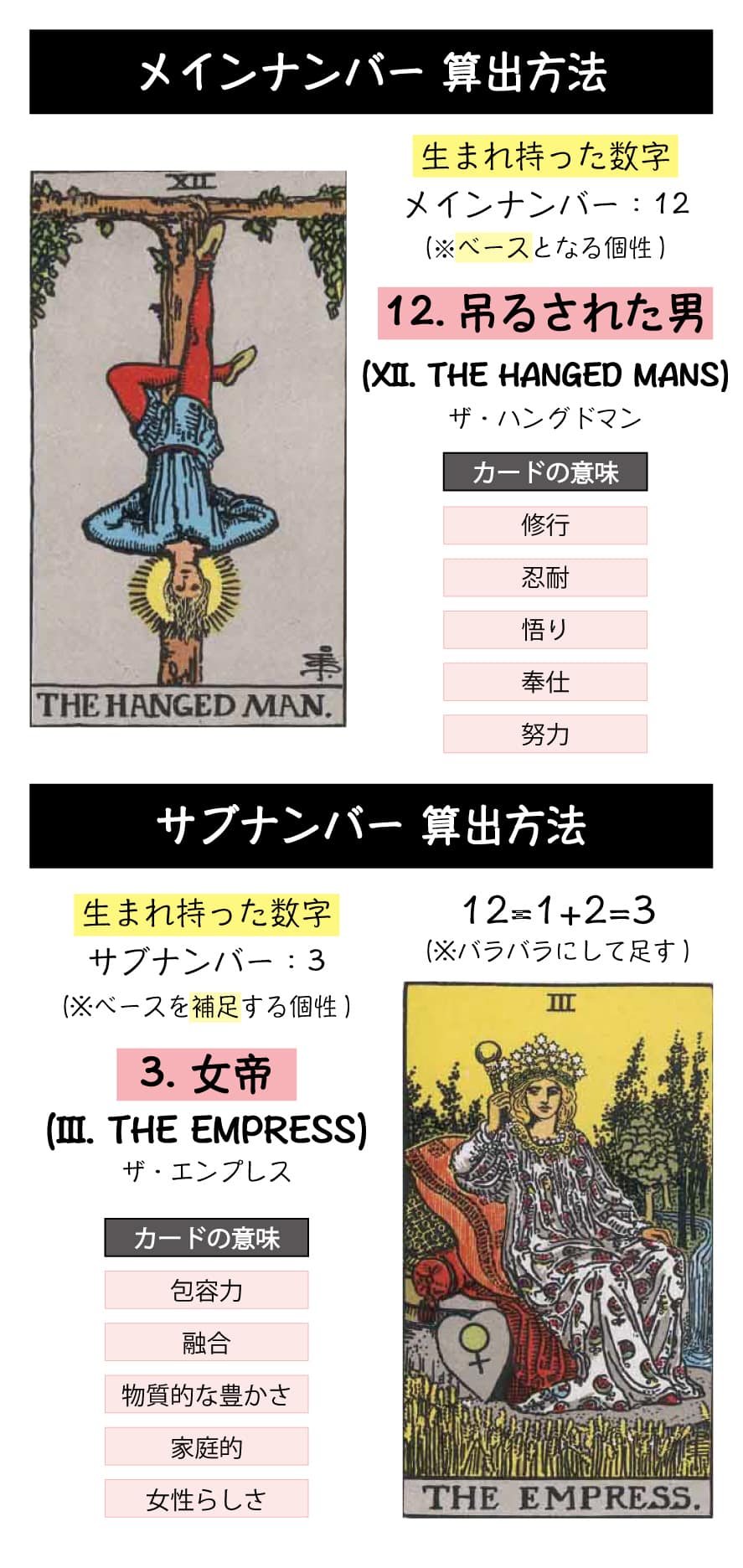 「12. 吊るされた男」は修行と努力のカードであり、「3. 女帝」は包容力と融合のカードのため、あなたは人とは違った考え方を持っている分、日常生活や対人関係で苦労してしまいますが、相手を受け入れる心の余白も持っているため、誰も思い付かないような手段で成功する側面も持っています。