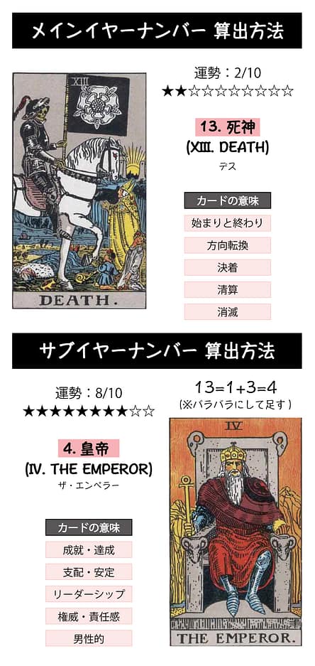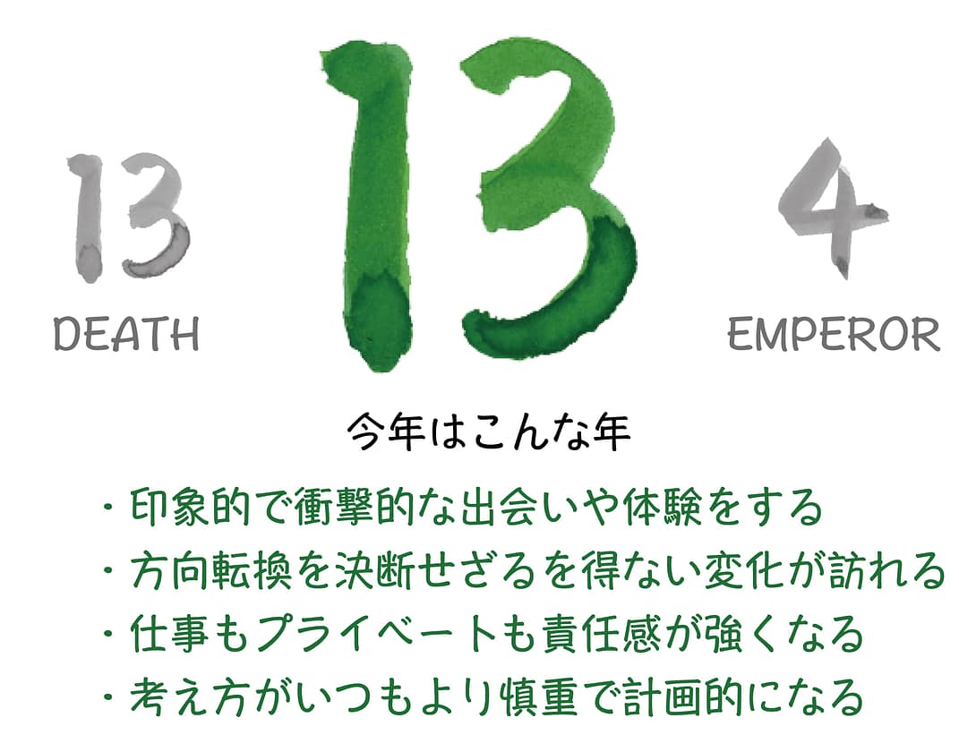 「13.死神」は終わりと始まりのカードのため変化・方向転換をする年となり、「4.皇帝」は土台を作り確実に人生を構築する建設的なカードのため人生の土台を計画し構築する年となります。