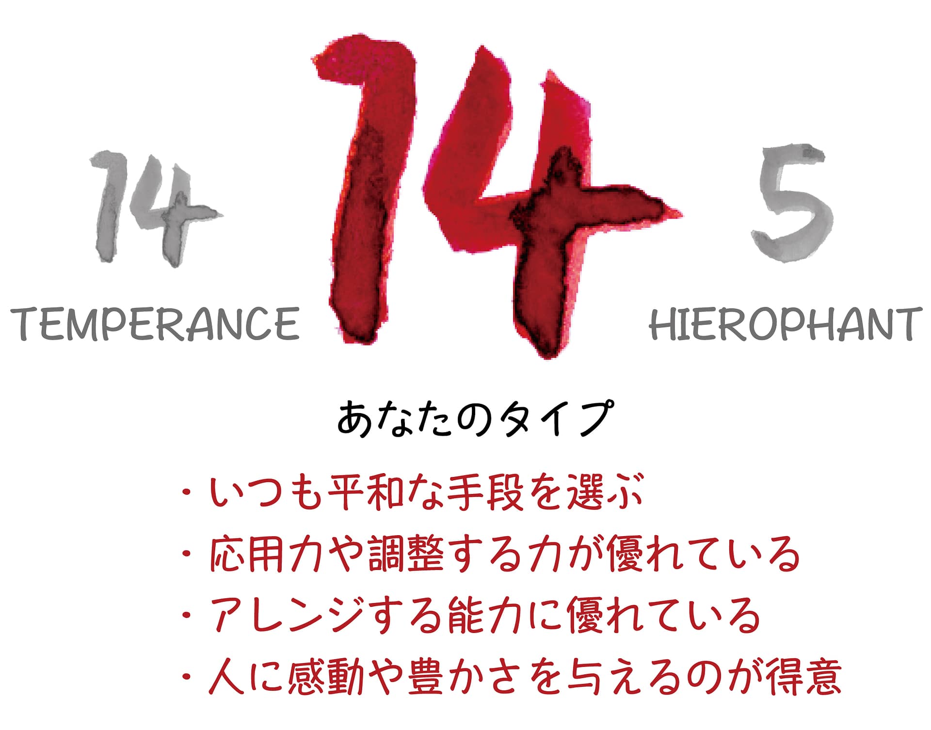 「14. 節制」は応用と柔軟さのカードであり、「5. 法王」は既存をアレンジし発信するカードのため、あなたは大きなリスクを取らず、安全な成功の道を選び、確実に成功を手に入れます。