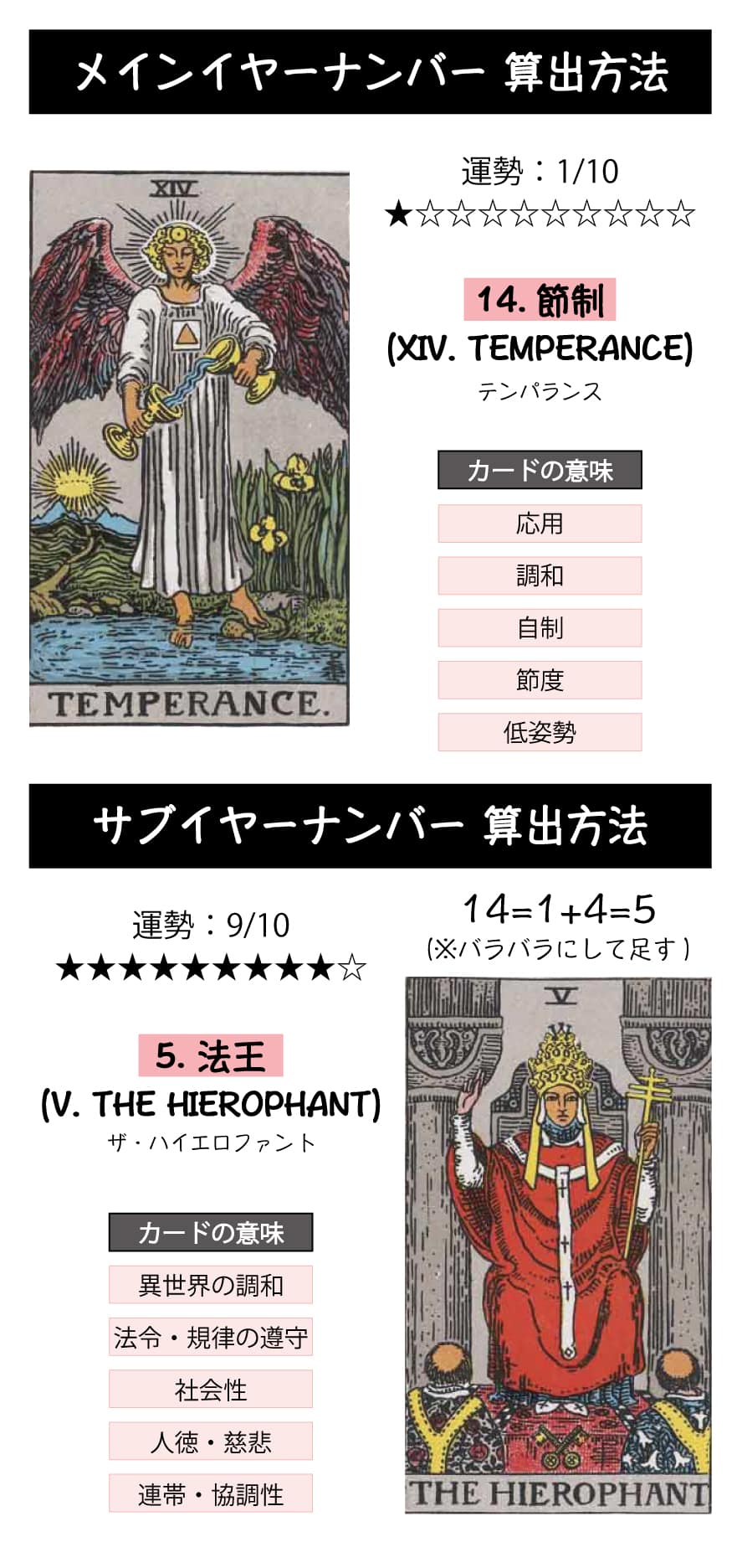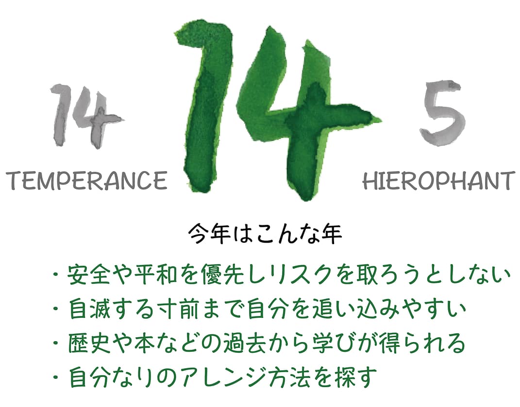 「14.節制」は応用と柔軟さのカードのため人生で応用力と柔軟性を磨く年となり、「5.法王」は既存をアレンジし発信するカードのため過去から学び人生に生かしていく年となります。