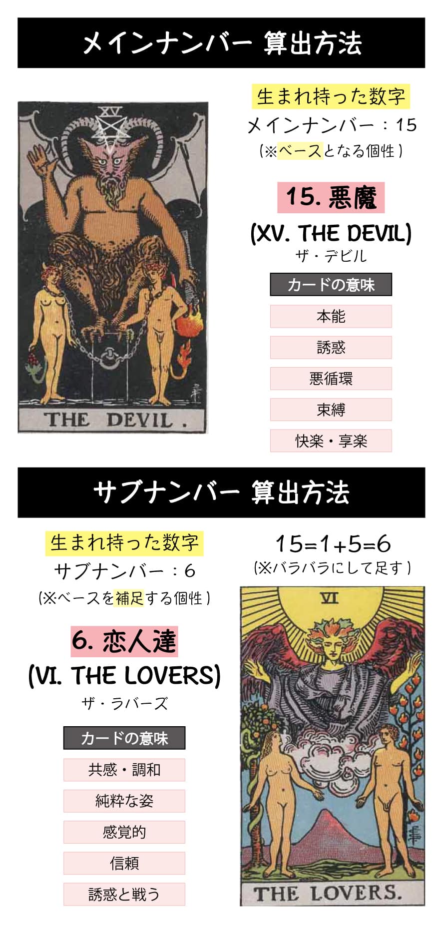 「15. 悪魔」は本能と誘惑のカードであり、「6. 恋人達」は五感と遊び心が豊かな感覚のカードのため、あなたはどちらのカードも五感が鋭く人生の楽しみ方も上手なため、いつも刺激的なことを求め続ける人生になりそうです。