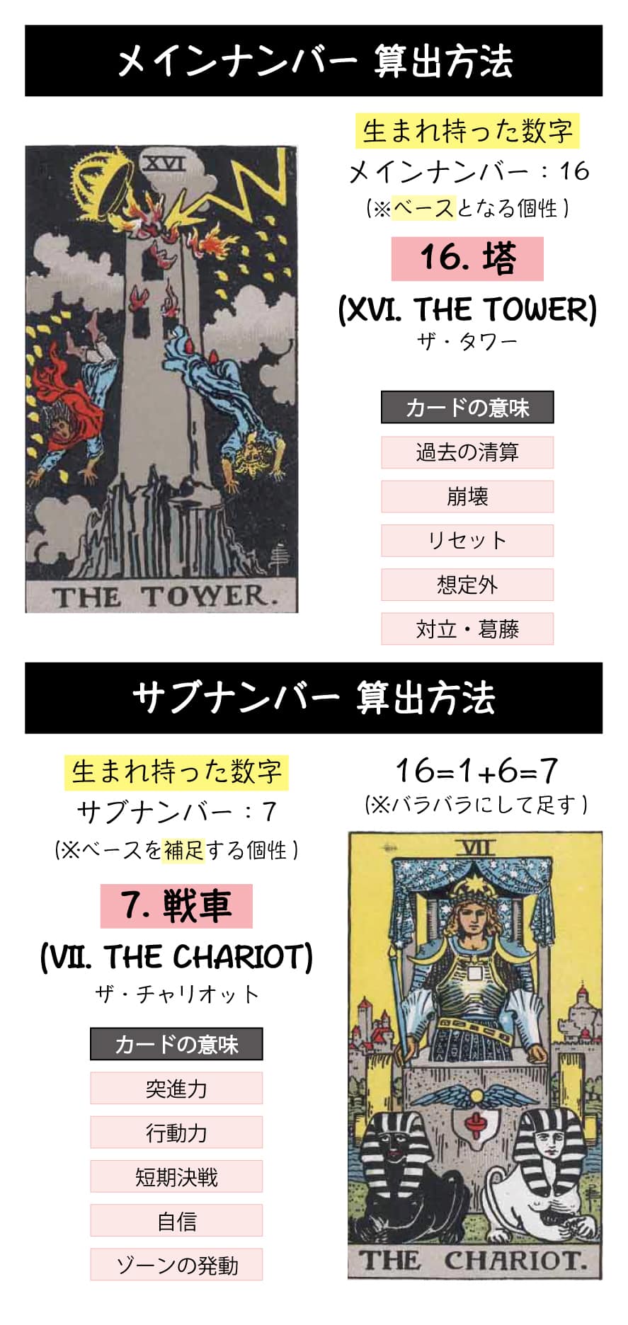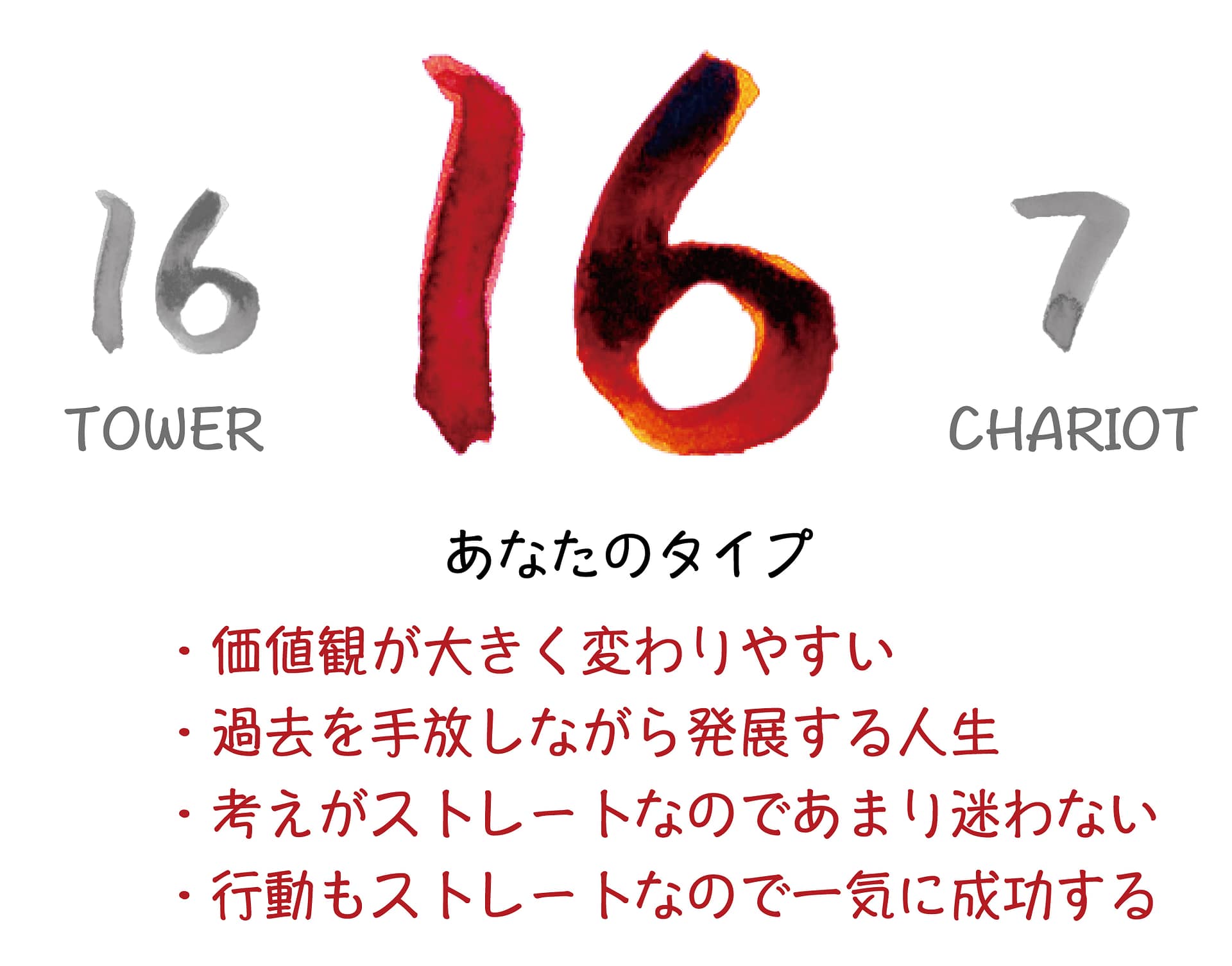 「16. 塔」は過去の清算やリセット・変化のカードであり、「7. 戦車」は行動力・前進するカードのため、あなたは一般的な常識などはおかまいなしに、一気に自身の理想を叶えるために前進し、そして変化して行きます。