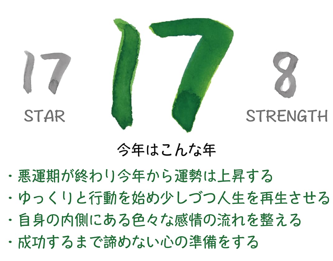 「17.星」は自分で自分を導くカードのため新しい希望を探し人生を再生させる年となり、「8.力」は高く遠くにある野望を目指して忍耐強く進んでいくカードのため色々な感情のバランスを整える年となります。