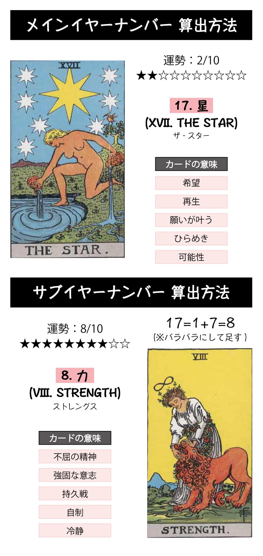 「17.星」は自分で自分を導くカードのため新しい希望を探し人生を再生させる年となり、「8.力」は高く遠くにある野望を目指して忍耐強く進んでいくカードのため色々な感情のバランスを整える年となります。