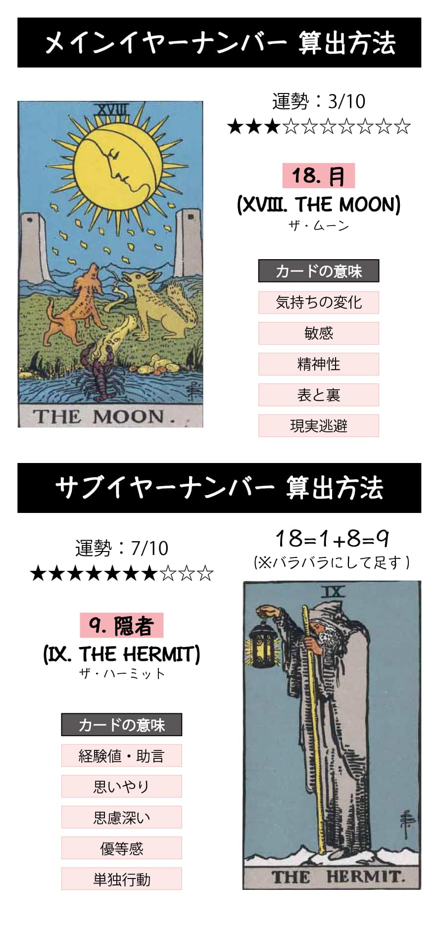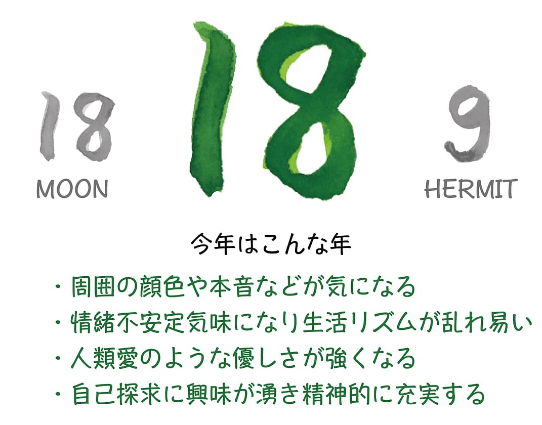 「18.月」は心のバイオリズム・精神的な変化のカードのため周囲から影響を受けやすく情緒不安定気味な年となり、「9.隠者」は真実や本質を世界へ発信していくカードのため自身の経験を共有する年となります。