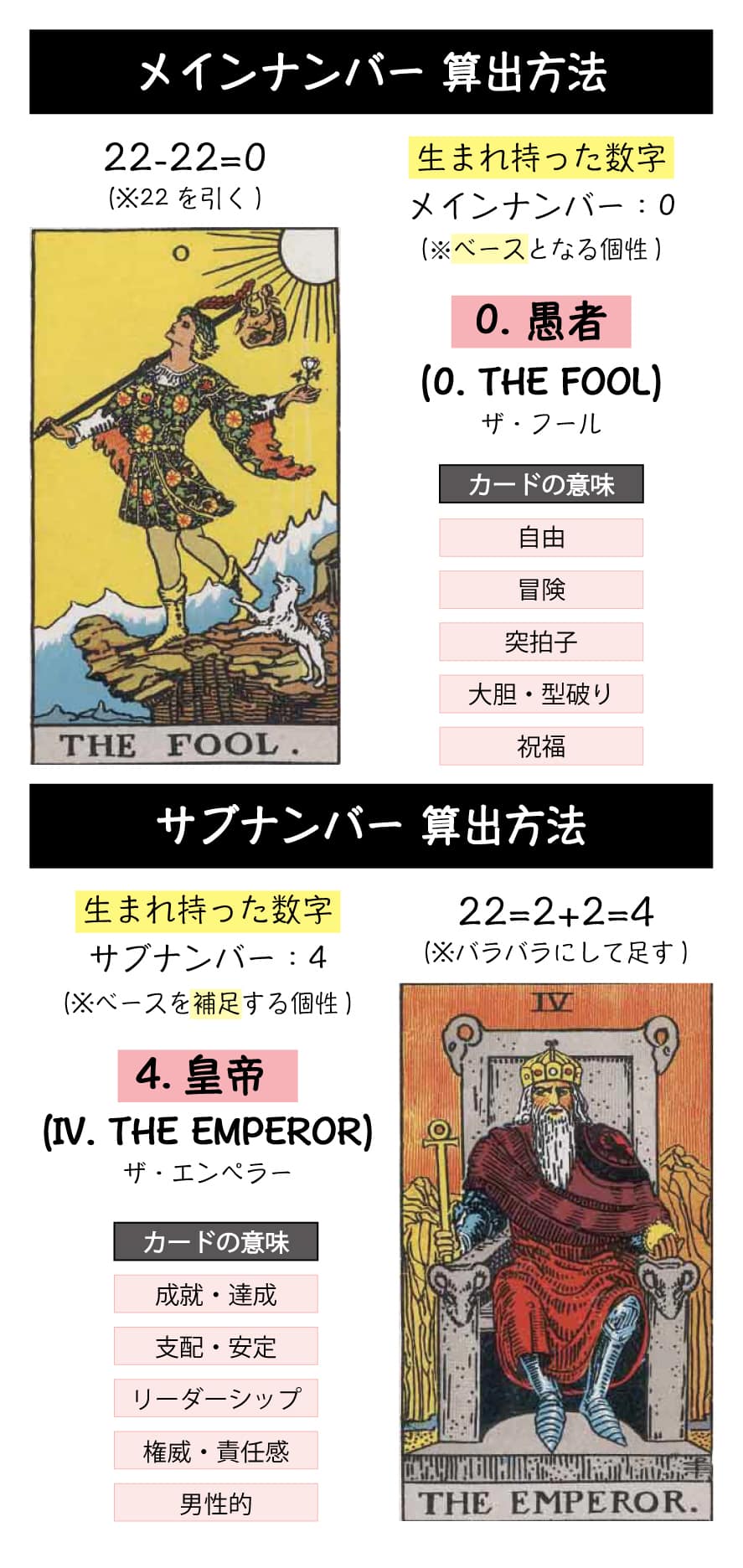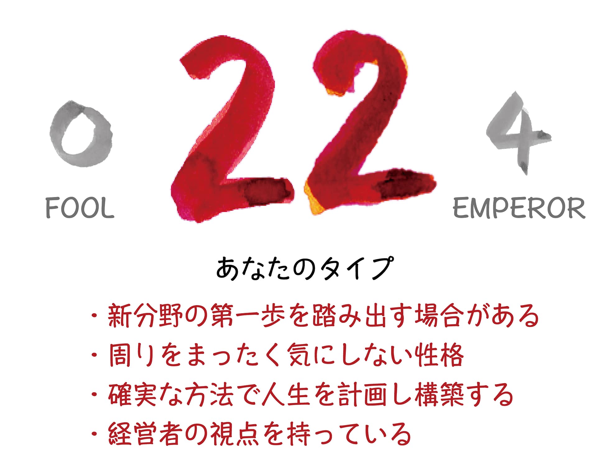「0. 愚者」は自由と冒険のカードであり、「4. 皇帝」は土台を作り確実に人生を構築する建設的なカードのため、あなたは周囲を気にせず、思い付きで行動する一面を持つ反面、土台を築き確実な方法で人生を構築するという、両極端な部分を合わせ持っているパーソナリティとなるでしょう。