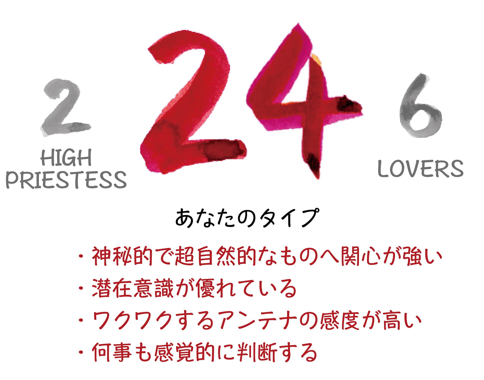 「2. 女教皇」は冷静で潜在意識が冴えているカードであり、「6. 恋人達」は五感と遊び心が豊かな感覚のカードのため、あなたは人類共通の無意識という感覚に冴え、観察力も鋭いため、発信する言葉や思想は、世の中の多くの人に受け入れられるでしょう。