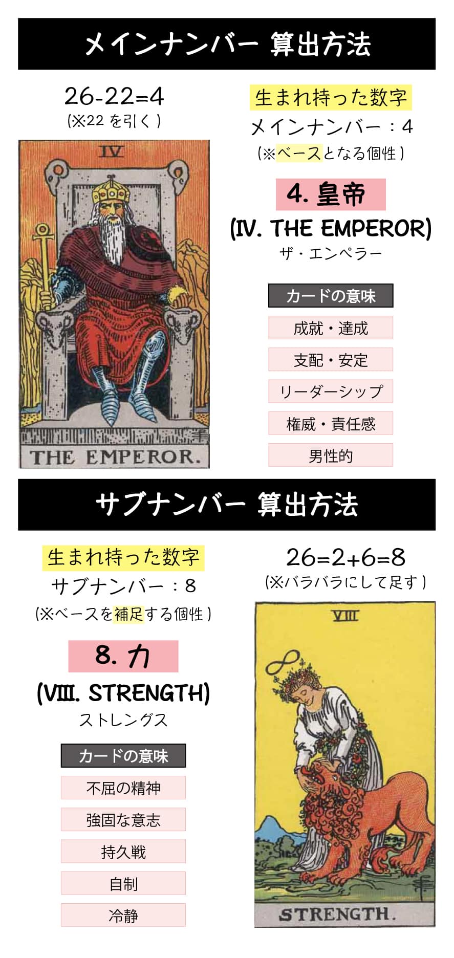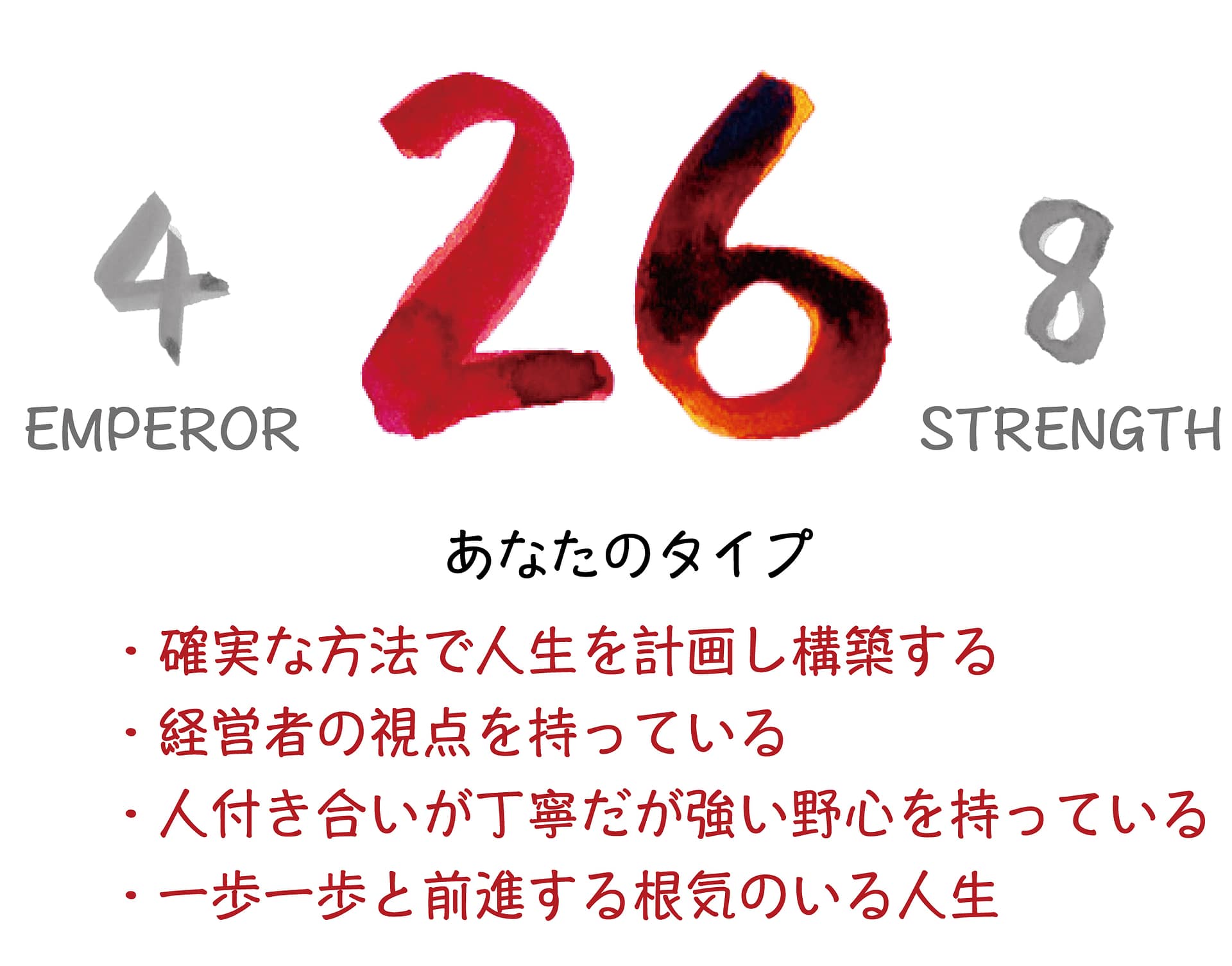 「4. 皇帝」 は土台を作り確実に人生を構築する建設的なカードであり、「8. 力」は一歩一歩前進していく忍耐強さのカードのため、あなたは自分の将来をしっかりと考えた上で、生きていくことになるでしょう。