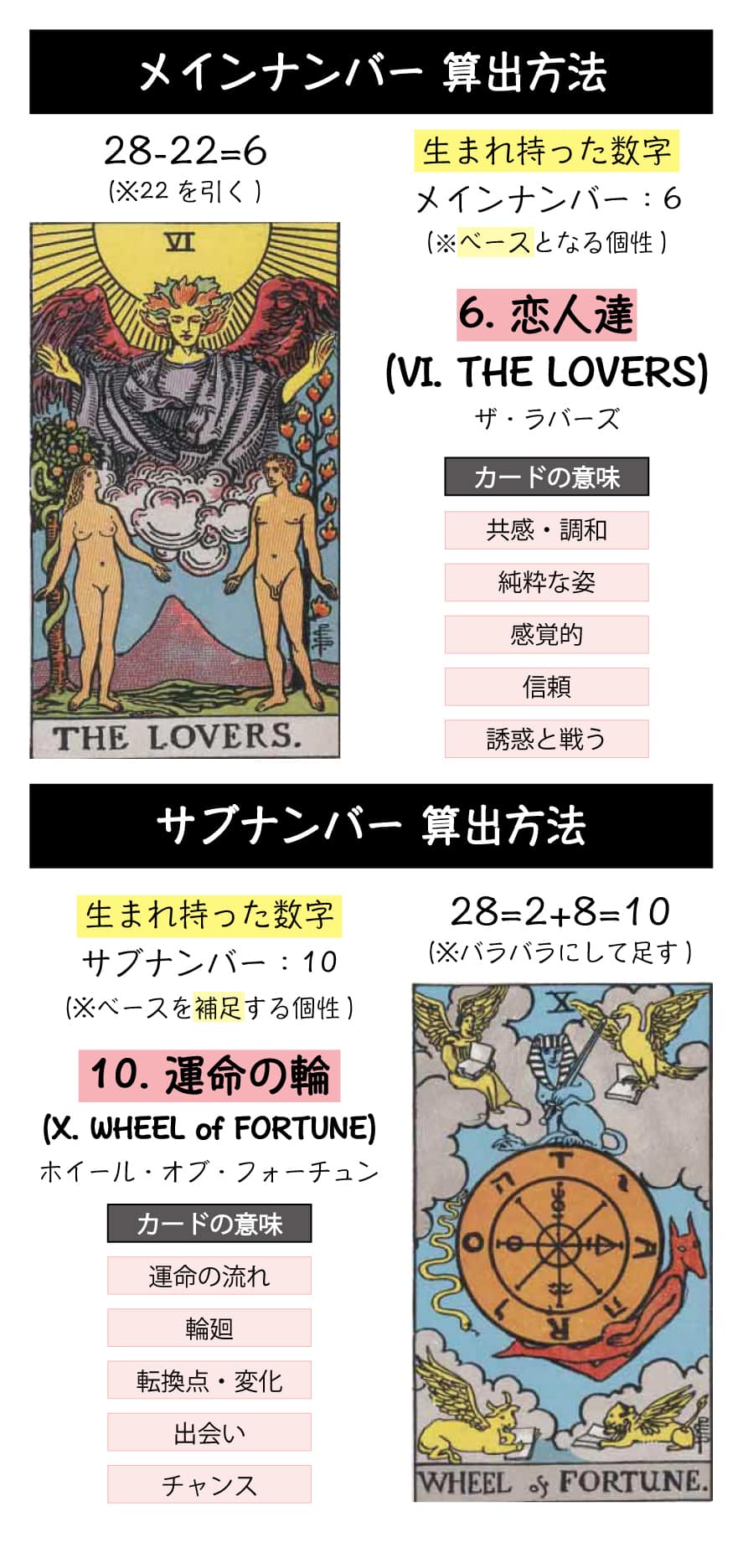 「6. 恋人達」は五感と遊び心が豊かな感覚のカードであり、「10. 運命の輪」はあまりこだわりを持たない直感のカードのため、あなたは人生を感覚的に判断し、楽しそうで面白そうな生き方へ進んで行くようです。