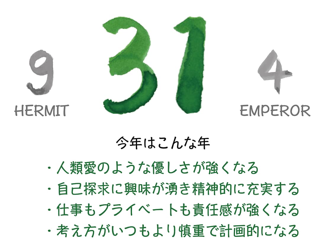 「9.隠者」は真実や本質を世界へ発信していくカードのため自身の経験を共有する年となり、「4.皇帝」は土台を作り確実に人生を構築する建設的なカードのため建設的な考え方で人生の土台を計画し構築する年となります。