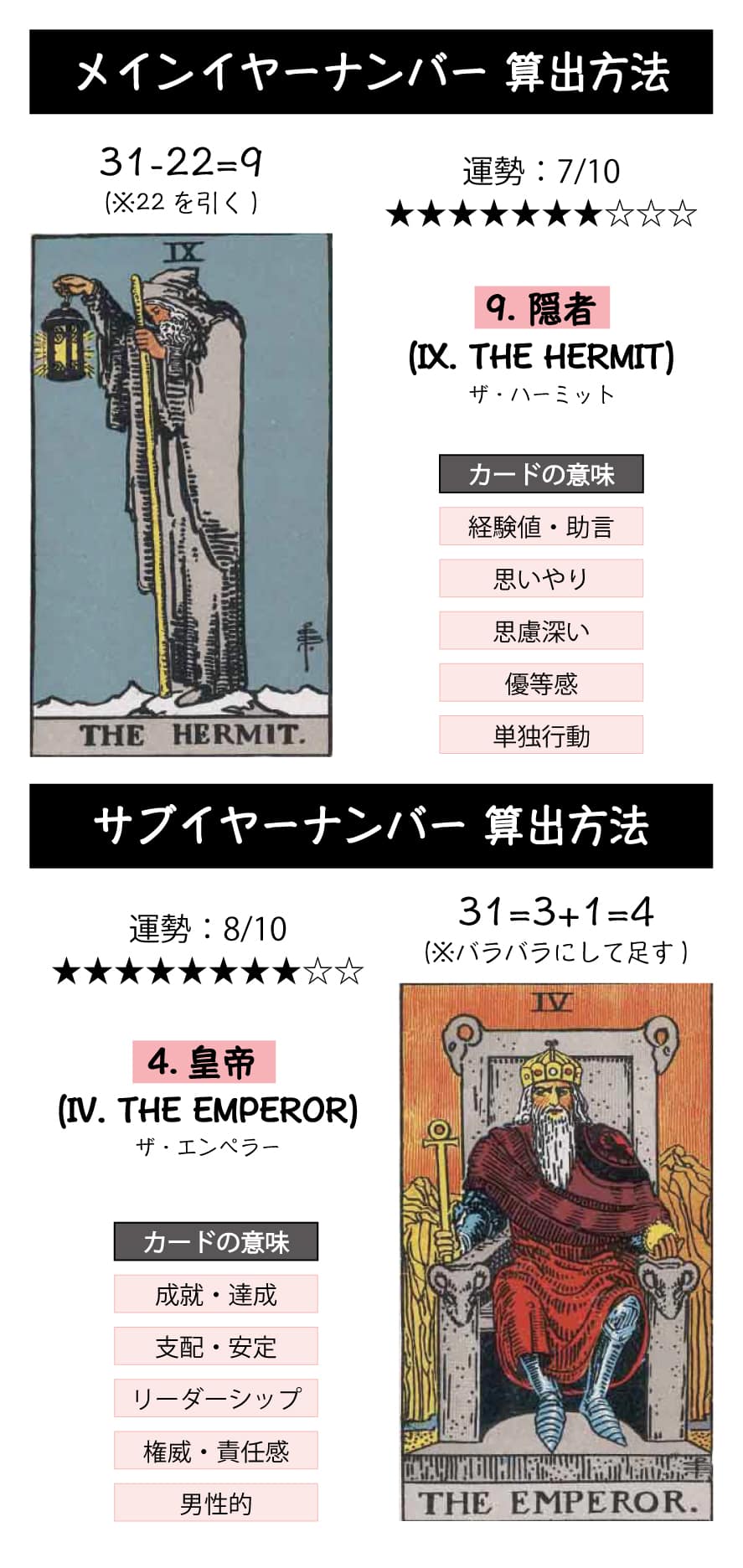 「9.隠者」は真実や本質を世界へ発信していくカードのため自身の経験を共有する年となり、「4.皇帝」は土台を作り確実に人生を構築する建設的なカードのため建設的な考え方で人生の土台を計画し構築する年となります。
