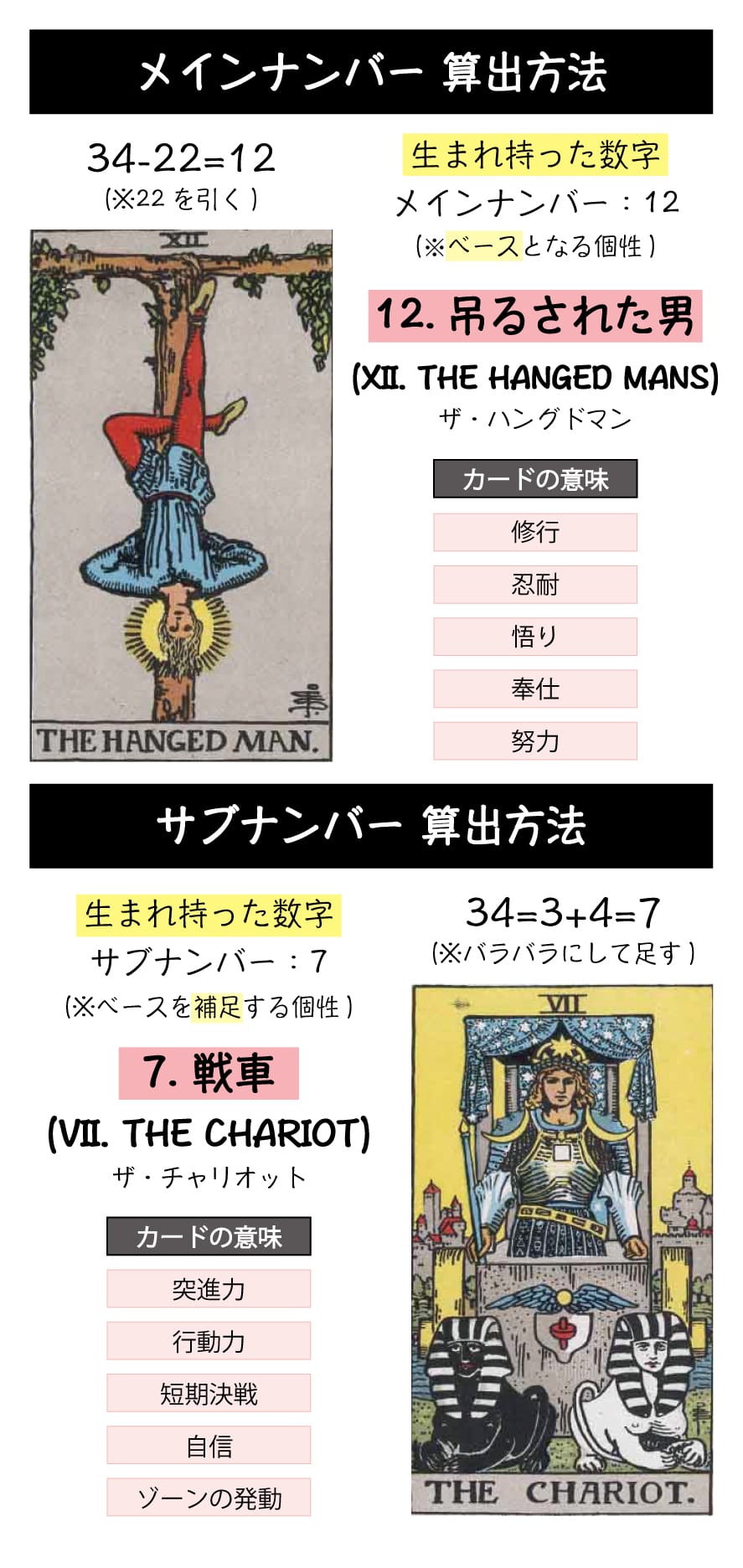 「12. 吊るされた男」は修行と努力のカードであり、「7. 戦車」は行動力・前進するカードのため、あなたは誰も思い付かないような独特の成功方法を使い、大きな成功を収める場合もあるようです。