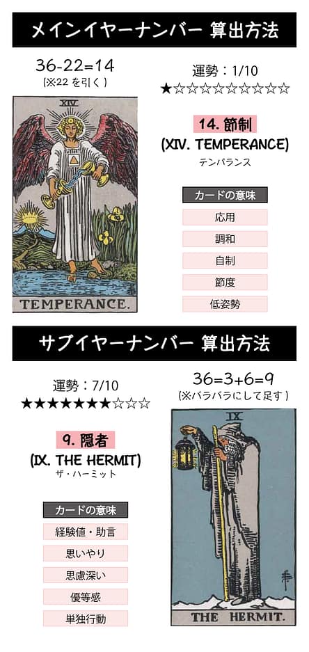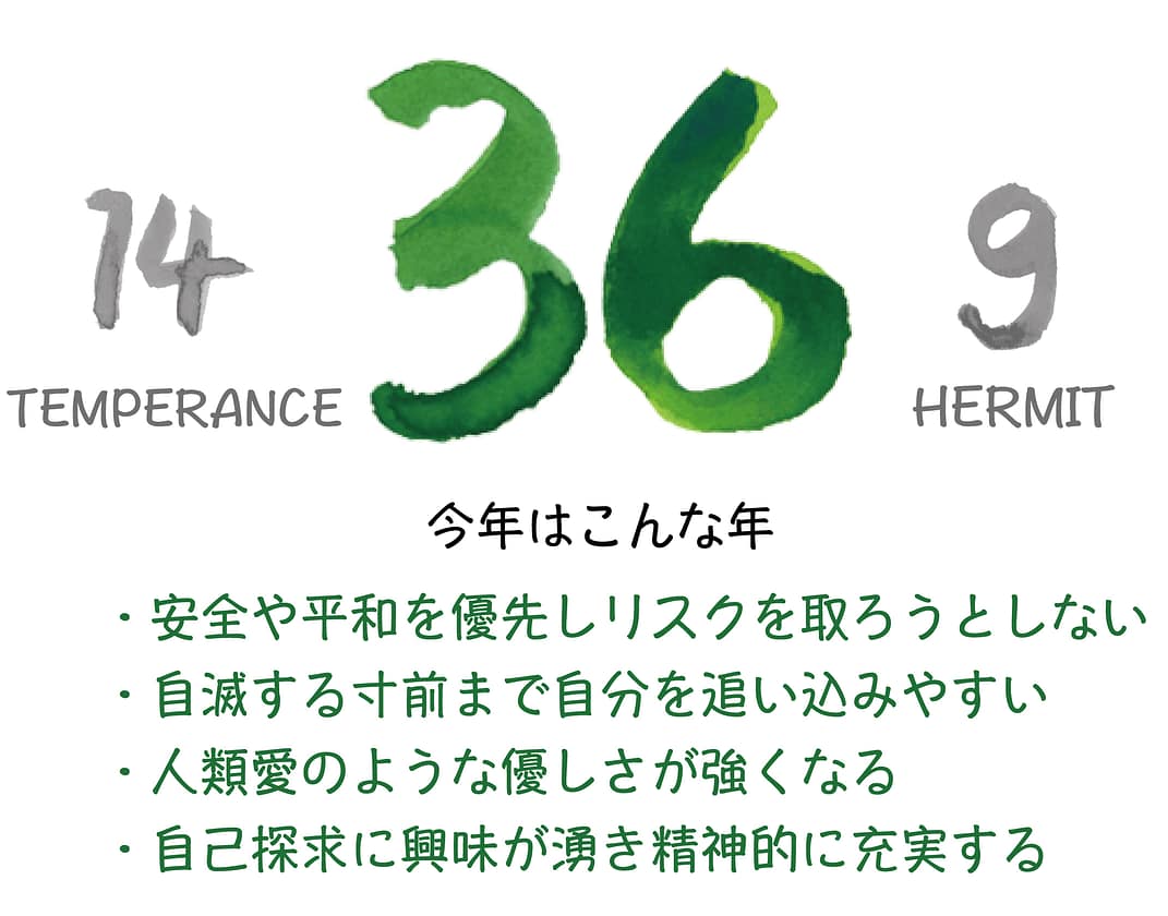 「14.節制」は応用と柔軟さのカードのため人生で応用力と柔軟性を磨く年となり、「9.隠者」は真実や本質を世界へ発信していくカードのため自身の経験を共有する年となります。