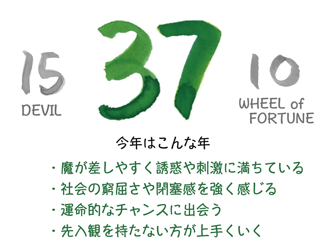 「15,悪魔」は本能と誘惑のカードのため自身の欲求が冴える年となり、「10.運命の輪」はあまりこだわりを持たない直感のカードのため運命的なチャンスに出会う年となります。