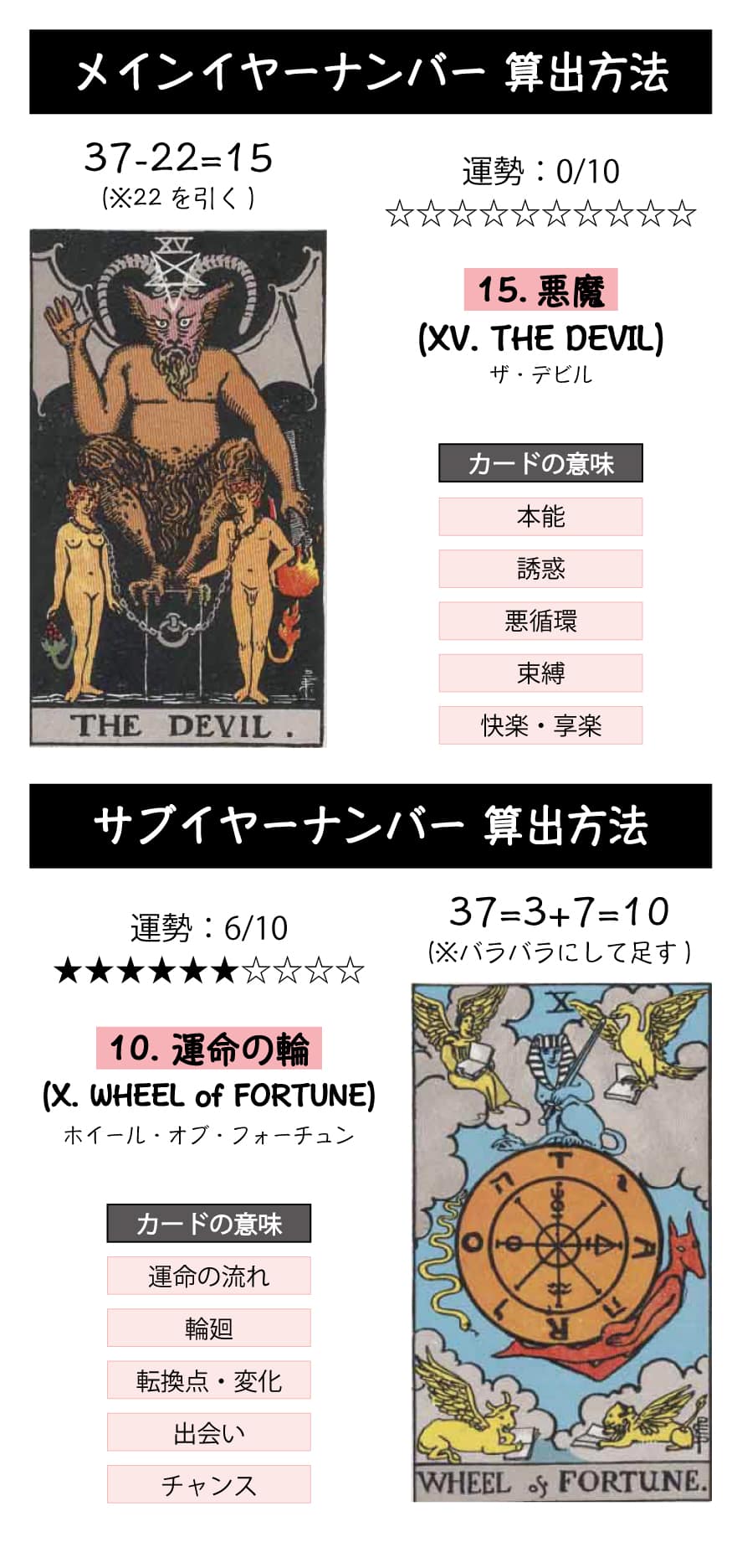 「15,悪魔」は本能と誘惑のカードのため自身の欲求が冴える年となり、「10.運命の輪」はあまりこだわりを持たない直感のカードのため運命的なチャンスに出会う年となります。