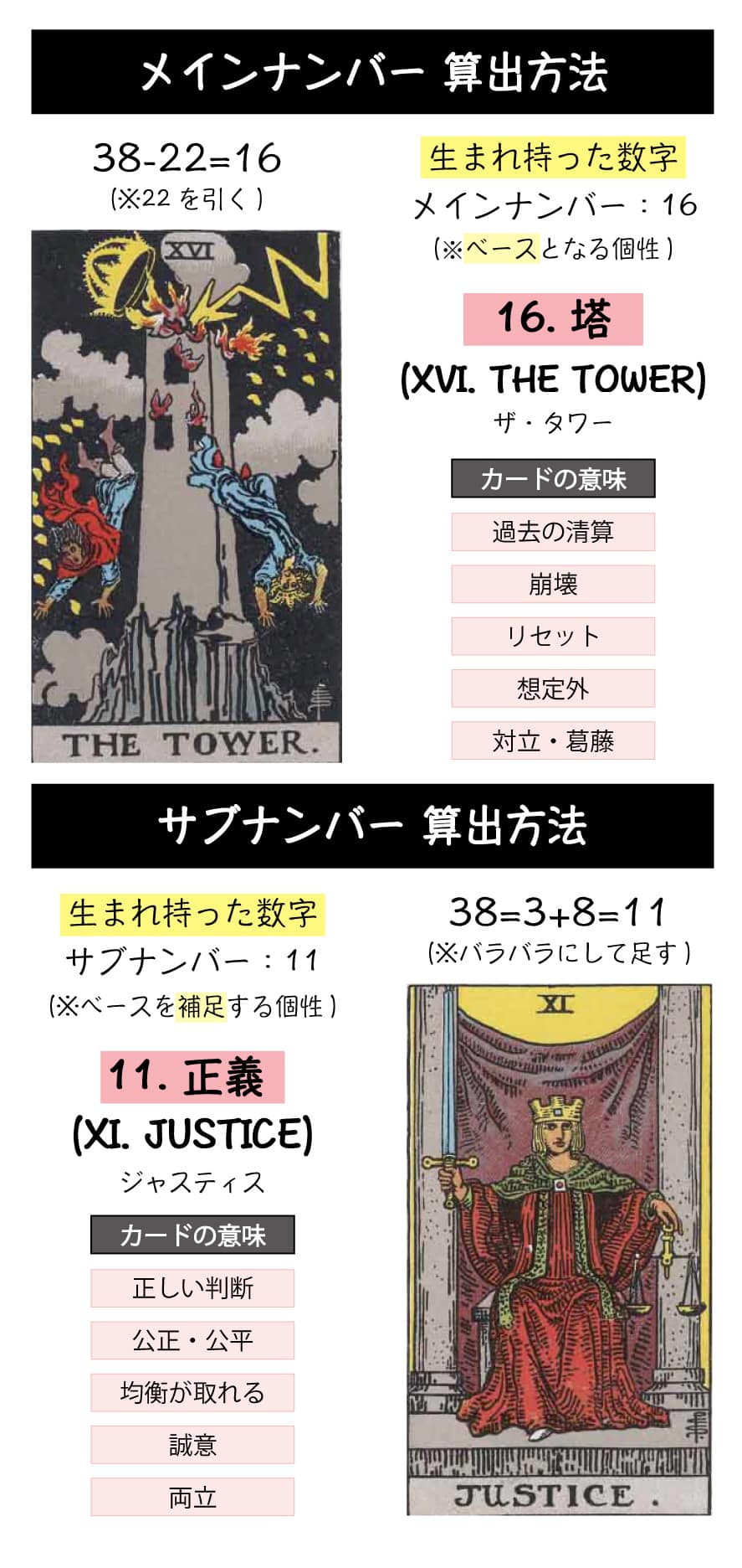 「16. 塔」は過去の清算やリセット・変化のカードであり、「11. 正義」はバランス感覚と判断のカードのため、あなたは性格がオフェンスタイプの人間です。