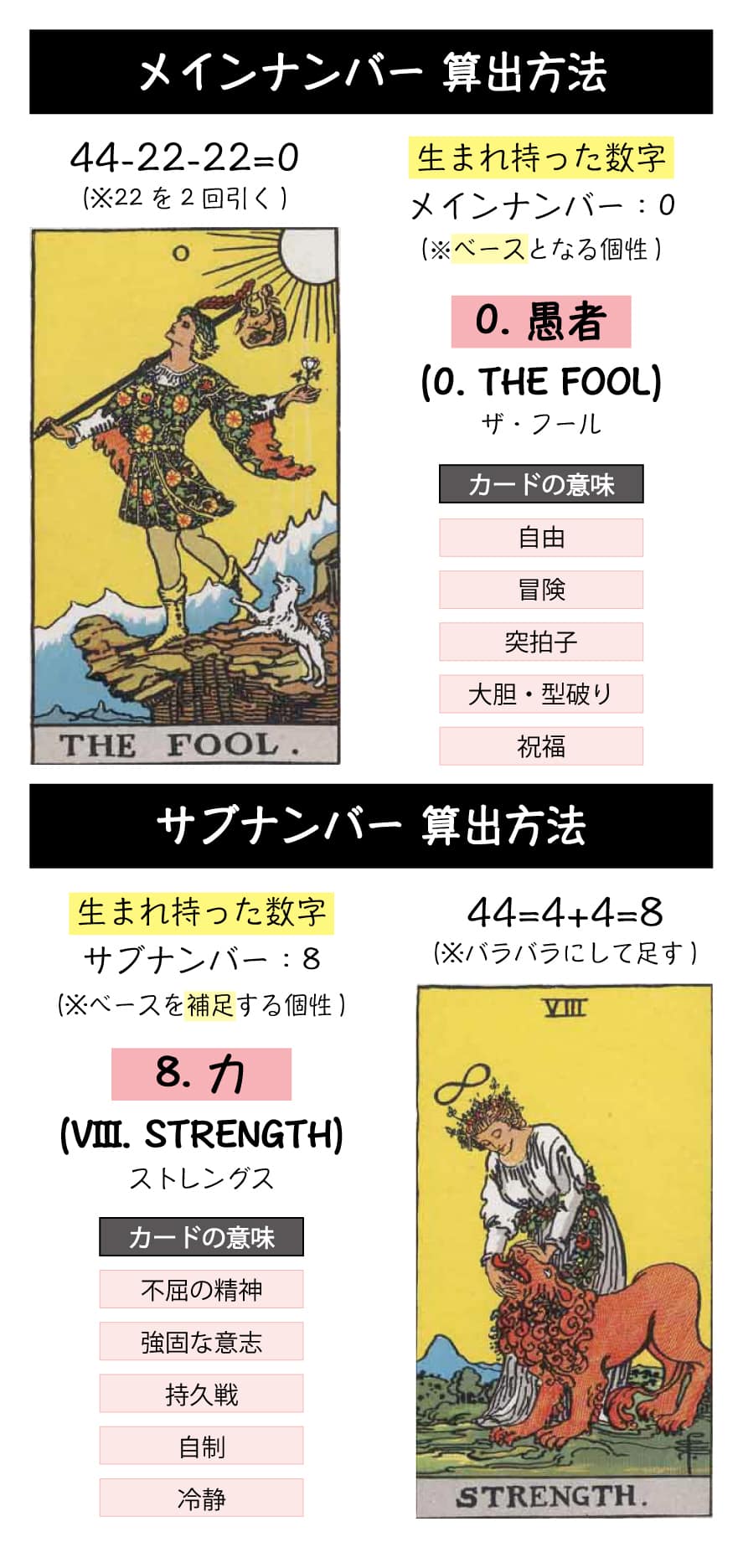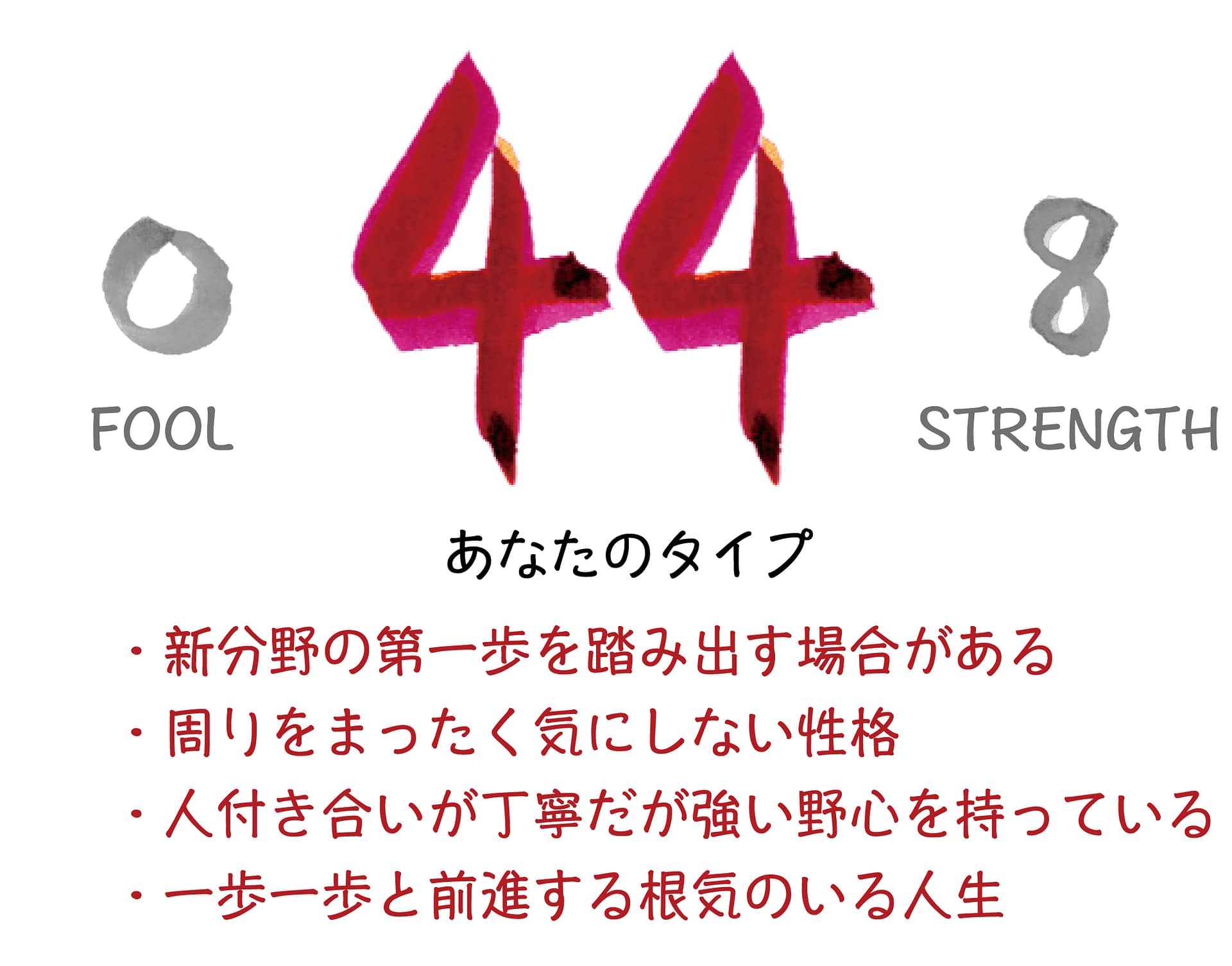 「0. 愚者」は自由と冒険のカードであり、「8. 力」は一歩一歩と前進していく忍耐強さのカードのため、あなたの中には、相反した2つの個性が同居していることになります。