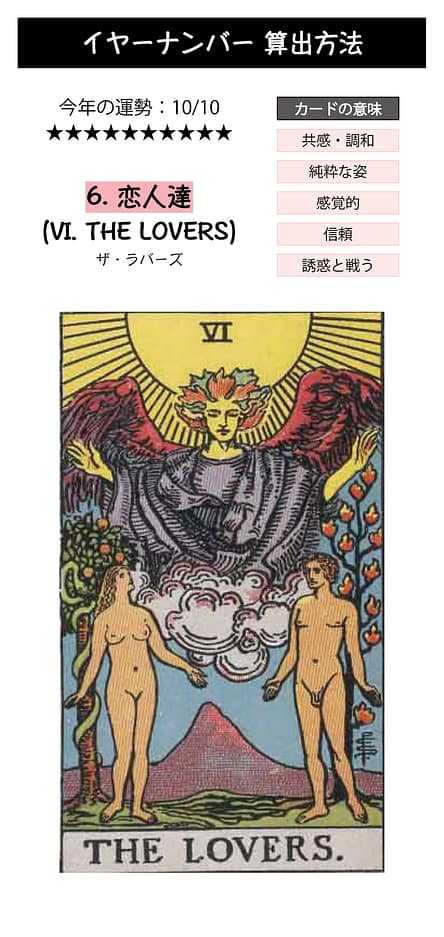 「恋人達」は五感と遊び心が豊かな感覚のカードのため、今年は「楽しそう面白そう」といった感覚が冴えた一年となるでしょう。