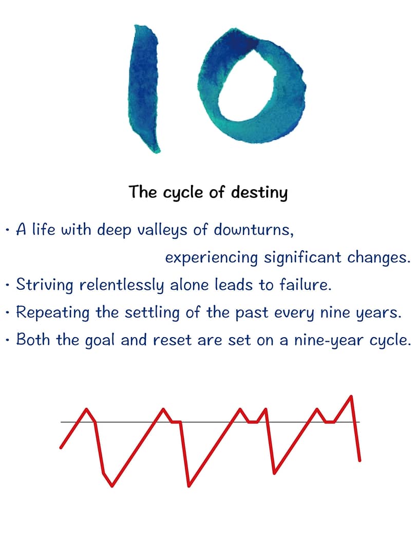 Within the 9-year cycle, “21. The World” and “0. The Fool” are also included, so life will consist of repeating years for setting goals and resets. Every 9-year period will involve redefining goals and continuing to take on new challenges. With “1. The Magician” in the mix, it appears that life will involve creating new value and progressing.