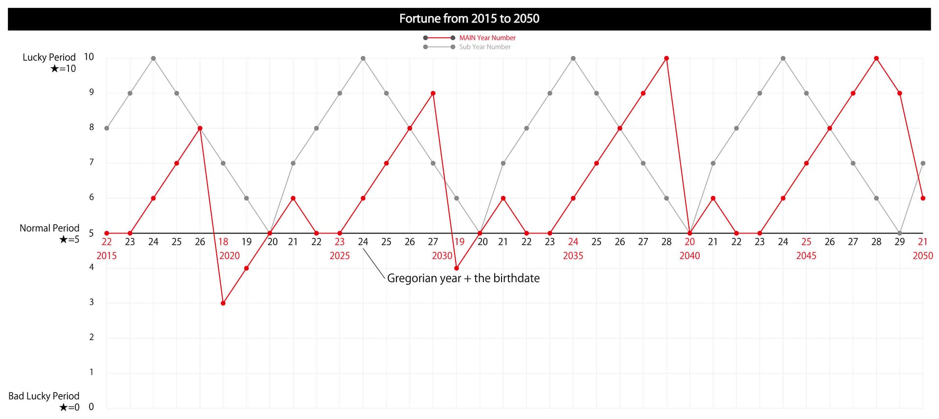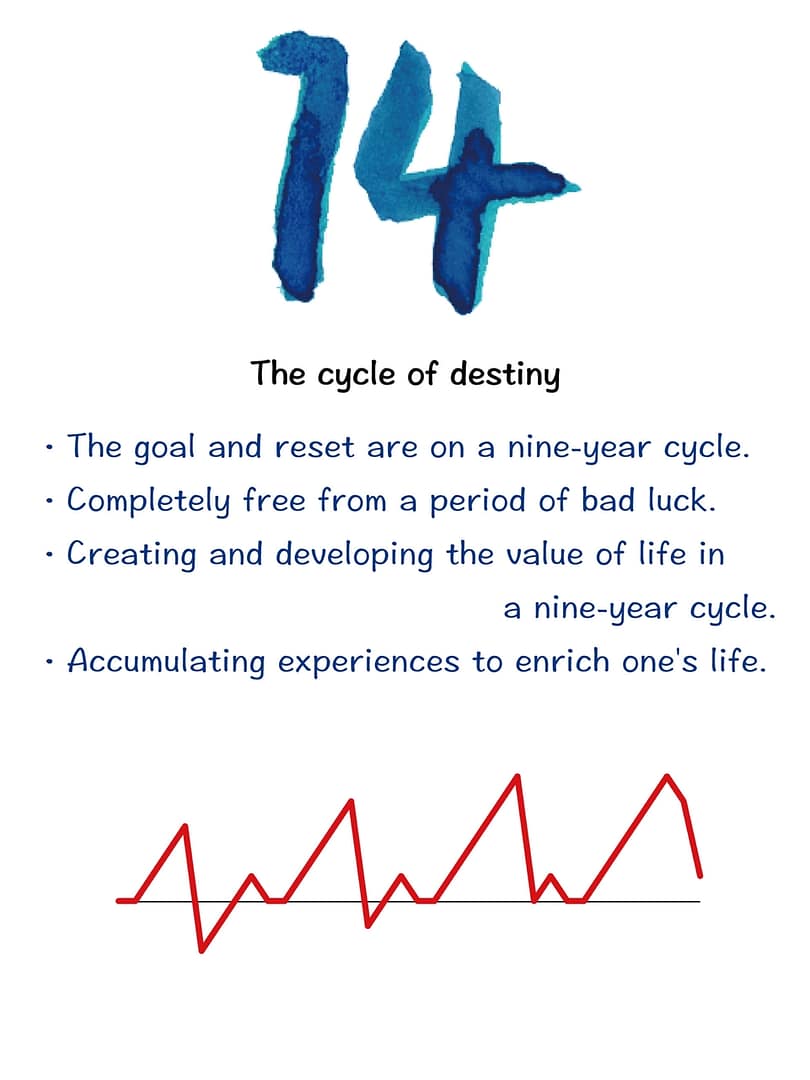 Basically, as “15. Devil” and “16. Tower” are not included within the 9-year cycle, the valleys in the “Fate Cycle” are not deep, and your life will be free from periods of misfortune. Instead, with “21. World” and “0. Fool” in the mix, you will experience repeated years of life goals and resets, continually setting new objectives and continuing to take on challenges in a 9-year cycle.