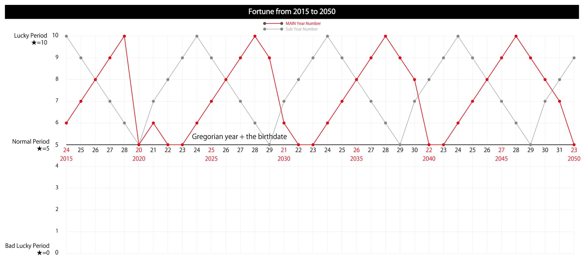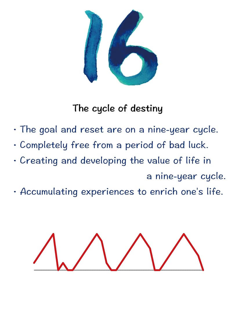 In essence, as “15. Devil” and “16. Tower” are not part of the 9-year cycle, the valleys in the “Fate Cycle” are not deep, and your life will be free from periods of misfortune. Instead, with “21. World” and “0. Fool” included, you will experience repeated years of setting life goals and resets, continuously redefining your goals and persistently pursuing challenges within a 9-year cycle.