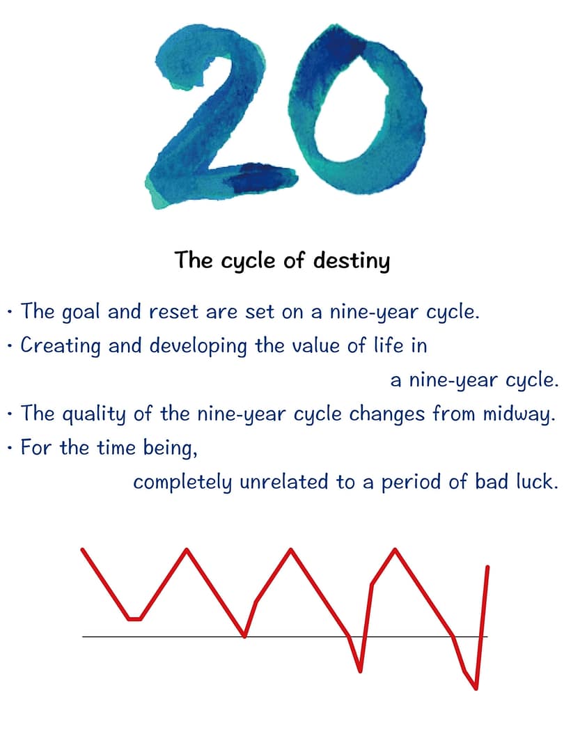 In general, because “15. Devil” and “16. Tower” are not present within the 9-year cycle, the “Cycle of Destiny” does not have deep valleys, and one’s life remains free from periods of bad luck.