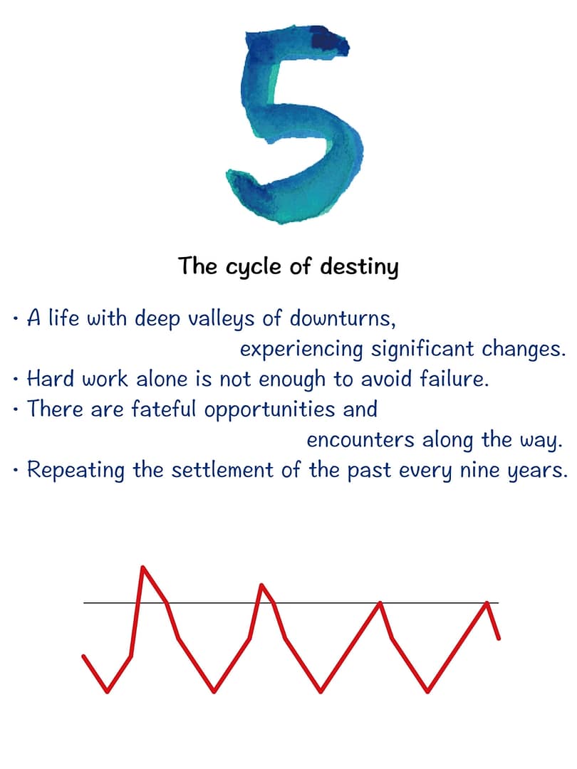 In the grand scheme of things, there’s a 9-year cycle that includes a period of bad luck (the two years with cards 15 and 16), so life is not as simple as rushing forward recklessly. Pursuing success, money, and desires may lead to crossing certain boundaries, causing disruptions in relationships, or even involvement in wrongdoing and crime. Even a life of dedicated hard work can be undermined, but this risk can be mitigated by maintaining composure or having calm individuals around you.