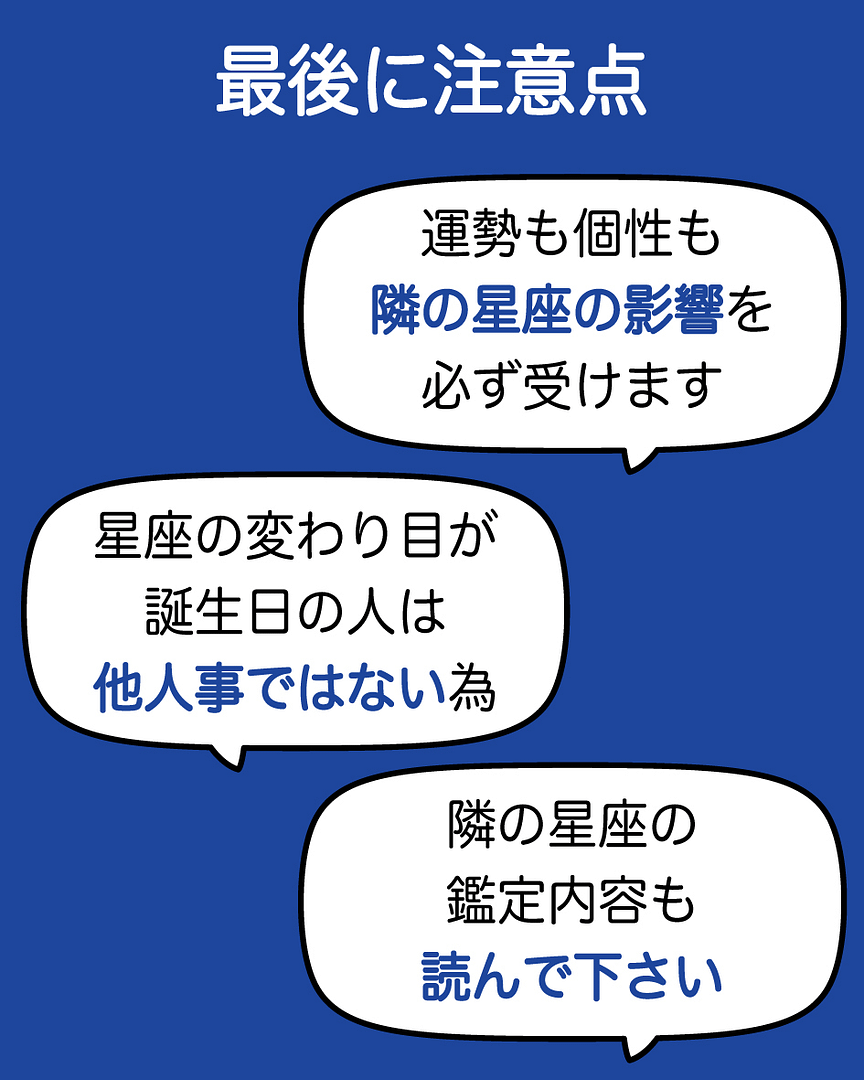 「待った」の姿勢で立ち止まらざる得ない事態に直面する、足かせとなる事態が発生する、自分のテリトリーから出ていかない、本当に出会いを求めていくのか危ない、恋人より家族に応えたり自分のキャリアアップを望む、どんな人が現れても結局見送る。