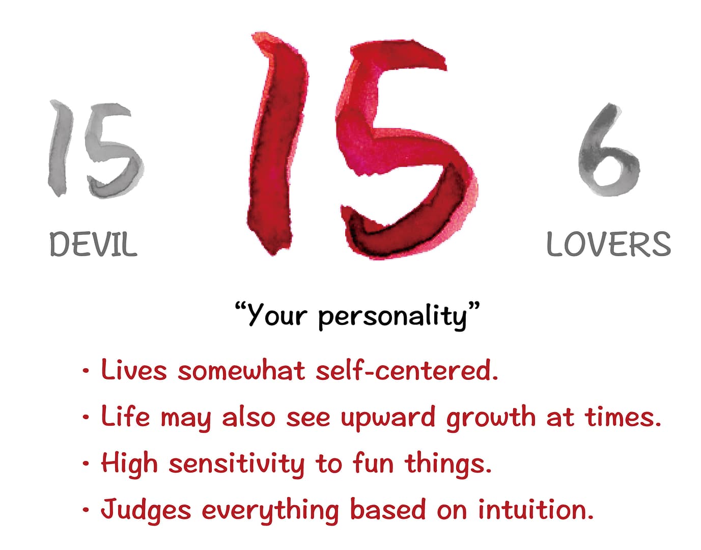 The 15th card, ‘The Devil,’ represents instinct and temptation, while the 6th card, ‘The Lovers,’ signifies the card of rich sensory experiences and playfulness. Both of these cards suggest that you have sharp senses and a knack for finding enjoyment in life, which could lead you to pursue an exciting and stimulating life.