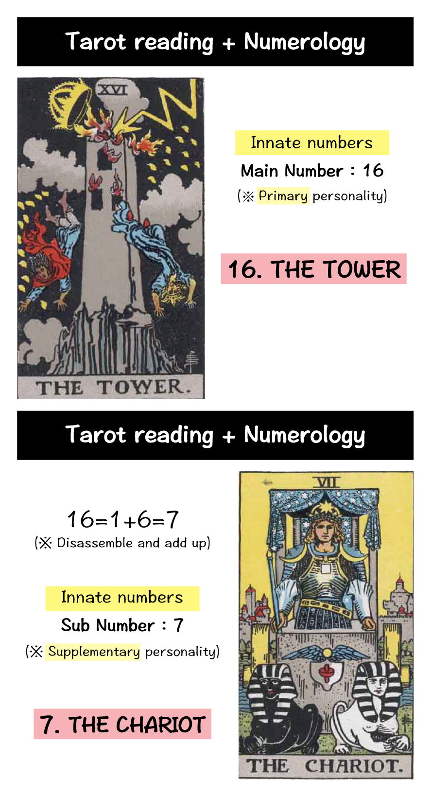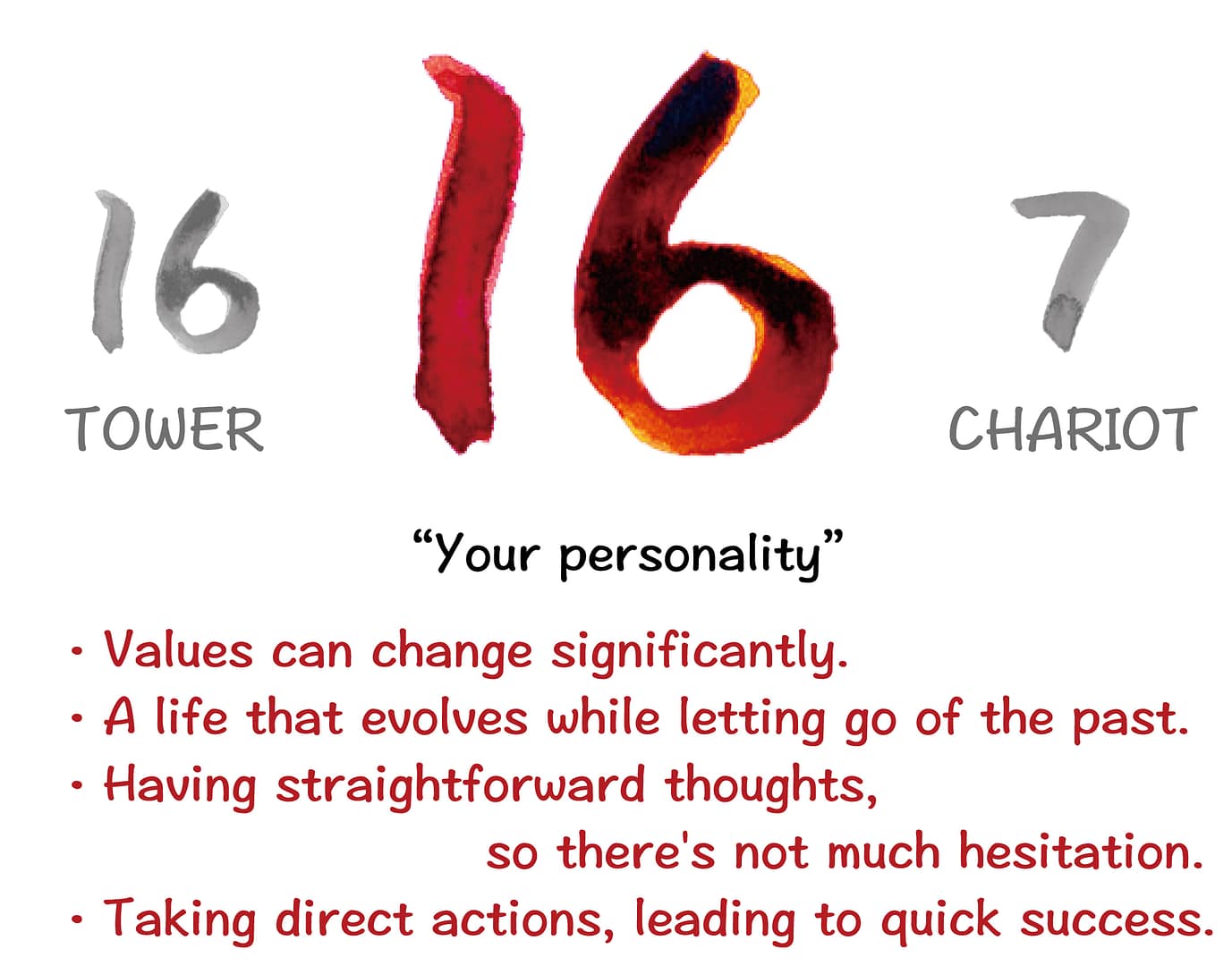 The 16th card, ‘The Tower,’ represents settling the past, resets, and change, while the 7th card, ‘The Chariot,’ signifies the card of initiative and forward movement. This suggests that you are someone who, regardless of conventional norms, charges forward to achieve your ideals and embraces change without hesitation.