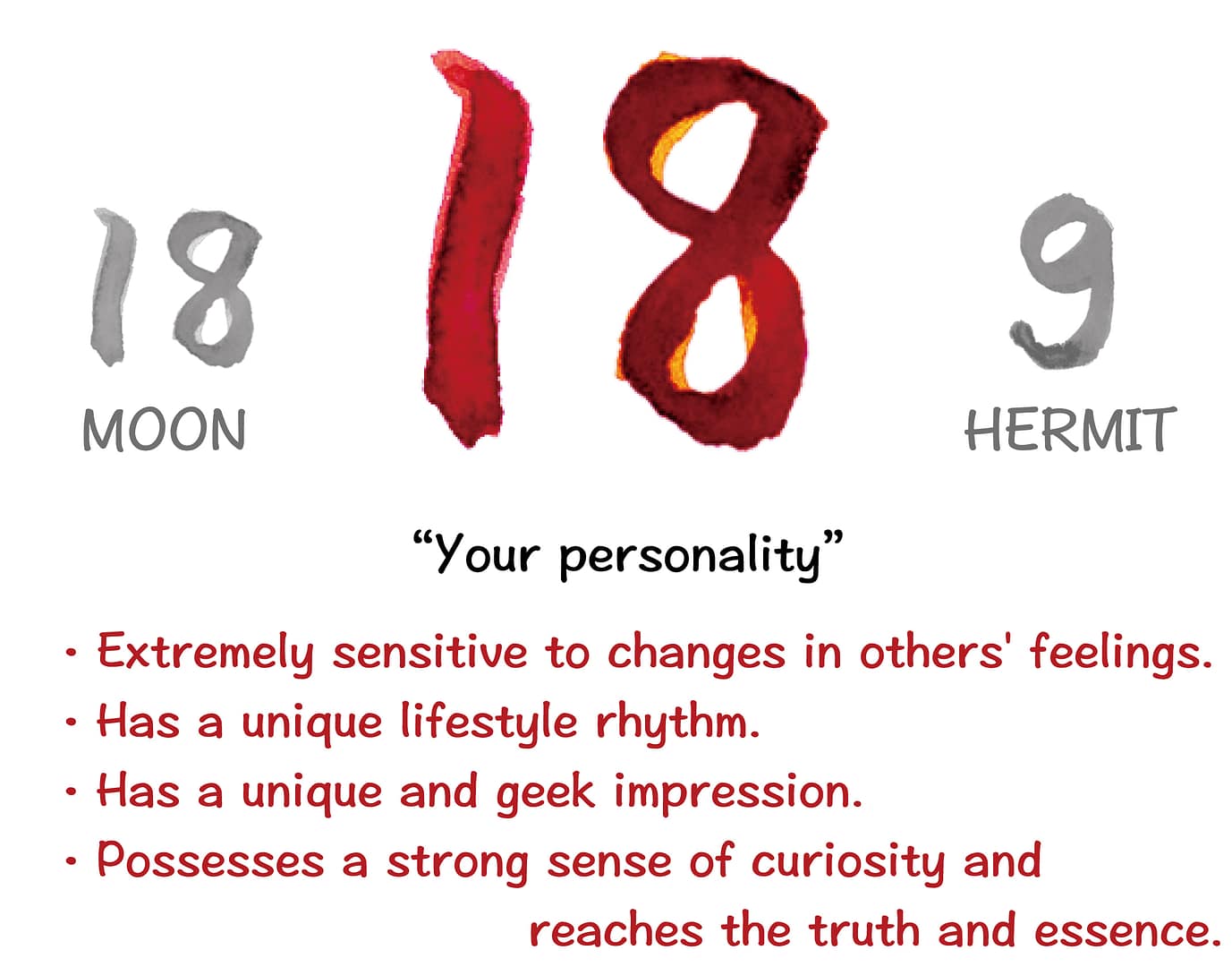 You aim to communicate the truths and essences you’ve discovered within your own experiences to the world. You embark on your life journey by self-reflecting and seeking answers on your own, often resulting in a unique impression that deviates slightly from the common sense of the world.