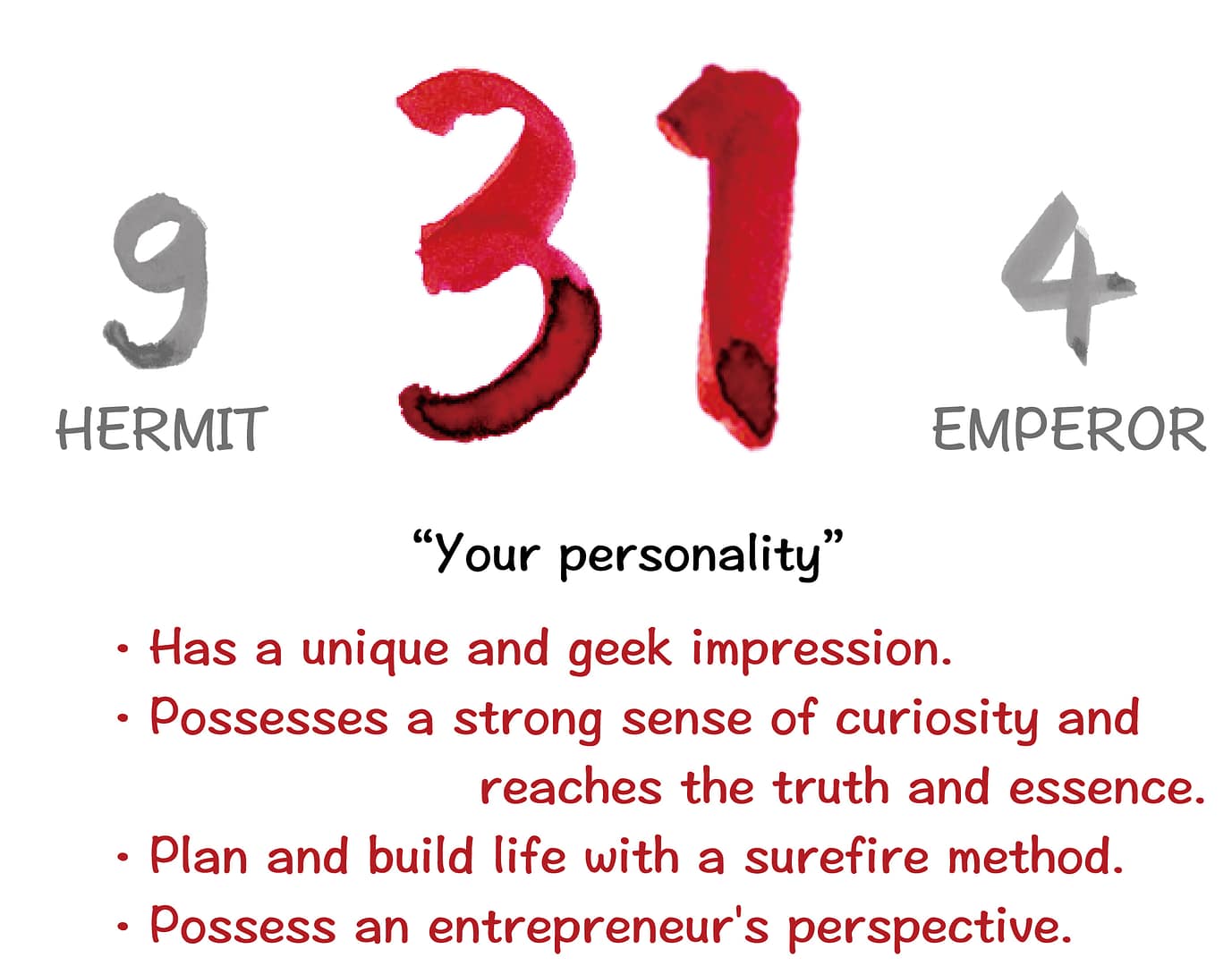 The 9th card, ‘The Hermit,’ signifies the dissemination of truth and essence to the world, while the 4th card, ‘The Emperor,’ represents the construction of a solid foundation for life. You may give off the impression of being somewhat out of sync with the world, but your keen eye for recognizing essence allows you to make many discoveries in life and spread them to the world.