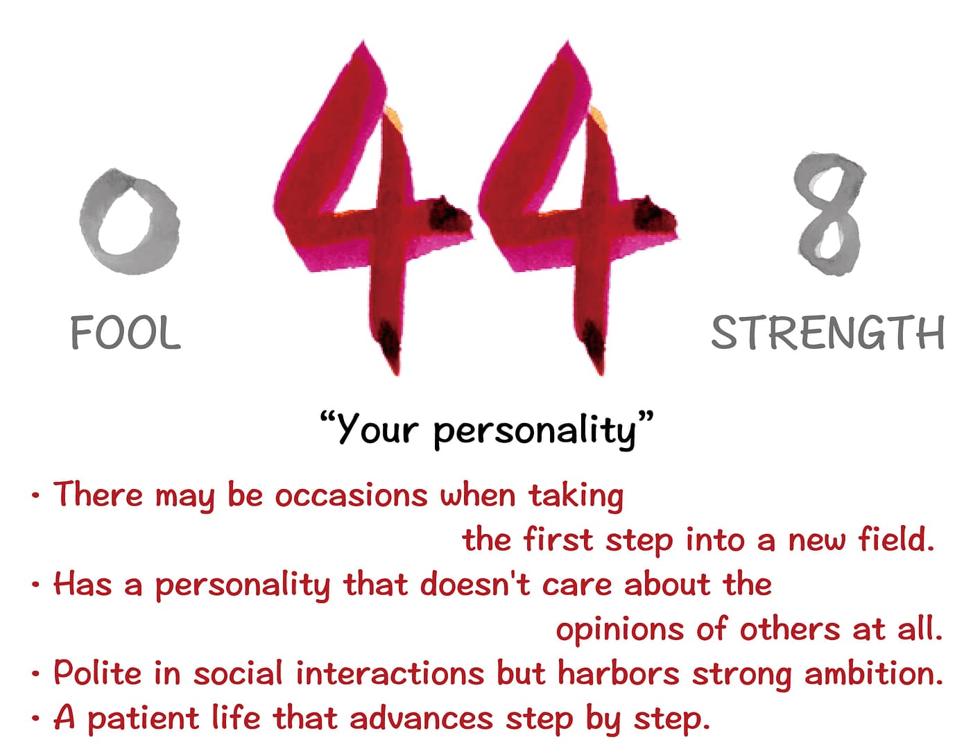 The 0th card, ‘The Fool,’ represents freedom and adventure, while the ‘8th card, ‘Strength,’ signifies the card of patience and gradual progress. This means that within you, two contrasting personalities coexist.