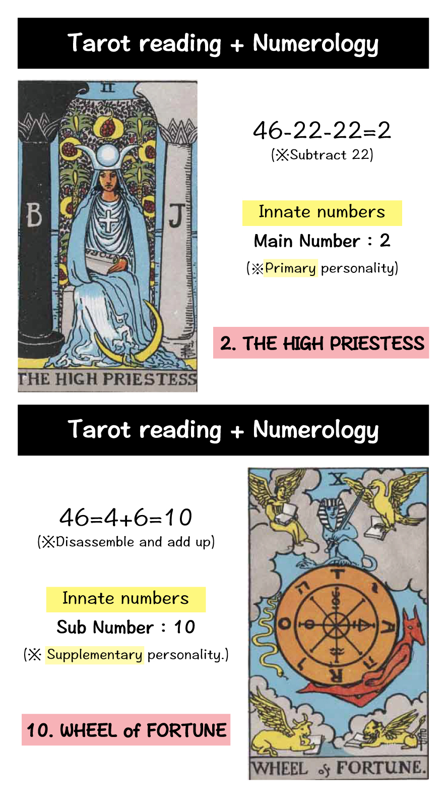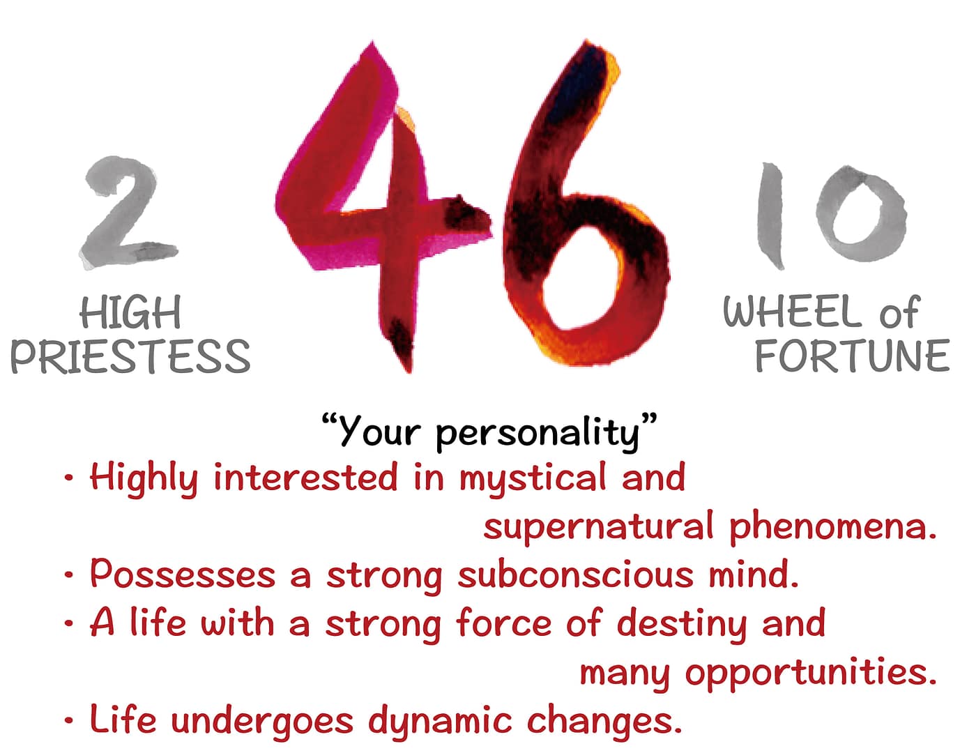 The 2nd card, ‘The High Priestess,’ represents a calm and keen subconscious, while the ’10th card, ‘Wheel of Fortune,’ signifies the card of intuition without holding onto attachments. This means that two contrasting personalities coexist within you.