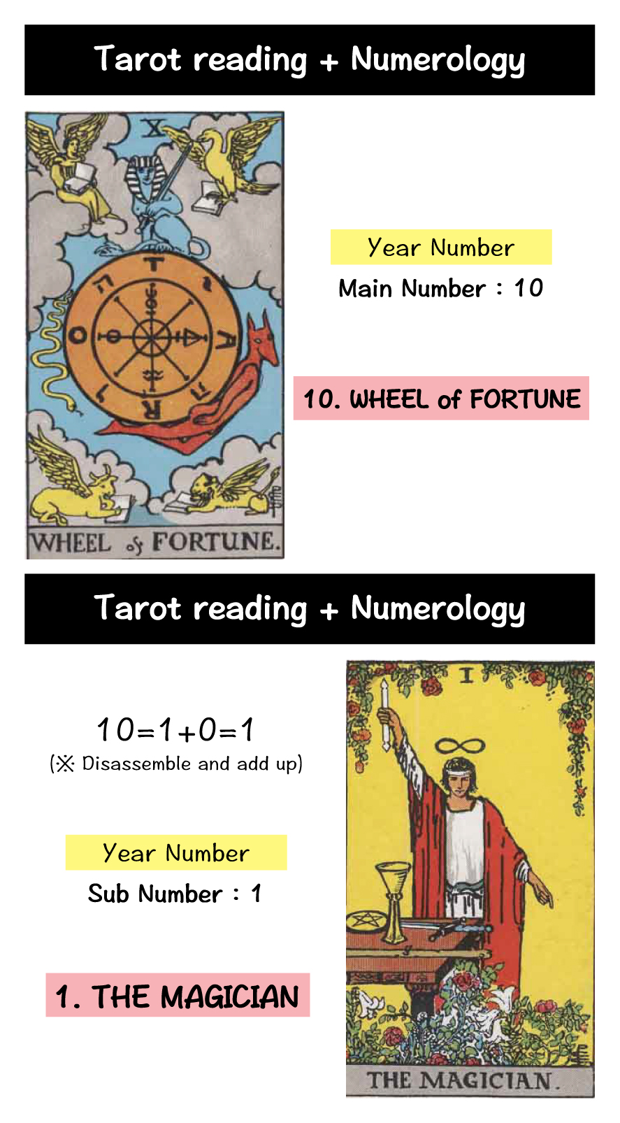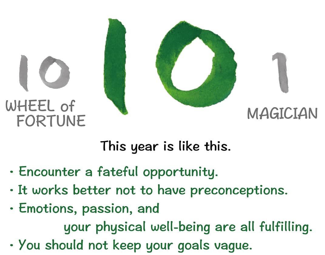 The “10. Wheel of Fortune” card, representing a year with few attachments and intuitive opportunities, is aligned with “1. The Magician,” a card that symbolizes the manifestation of one’s will, making it a year filled with creative drive.