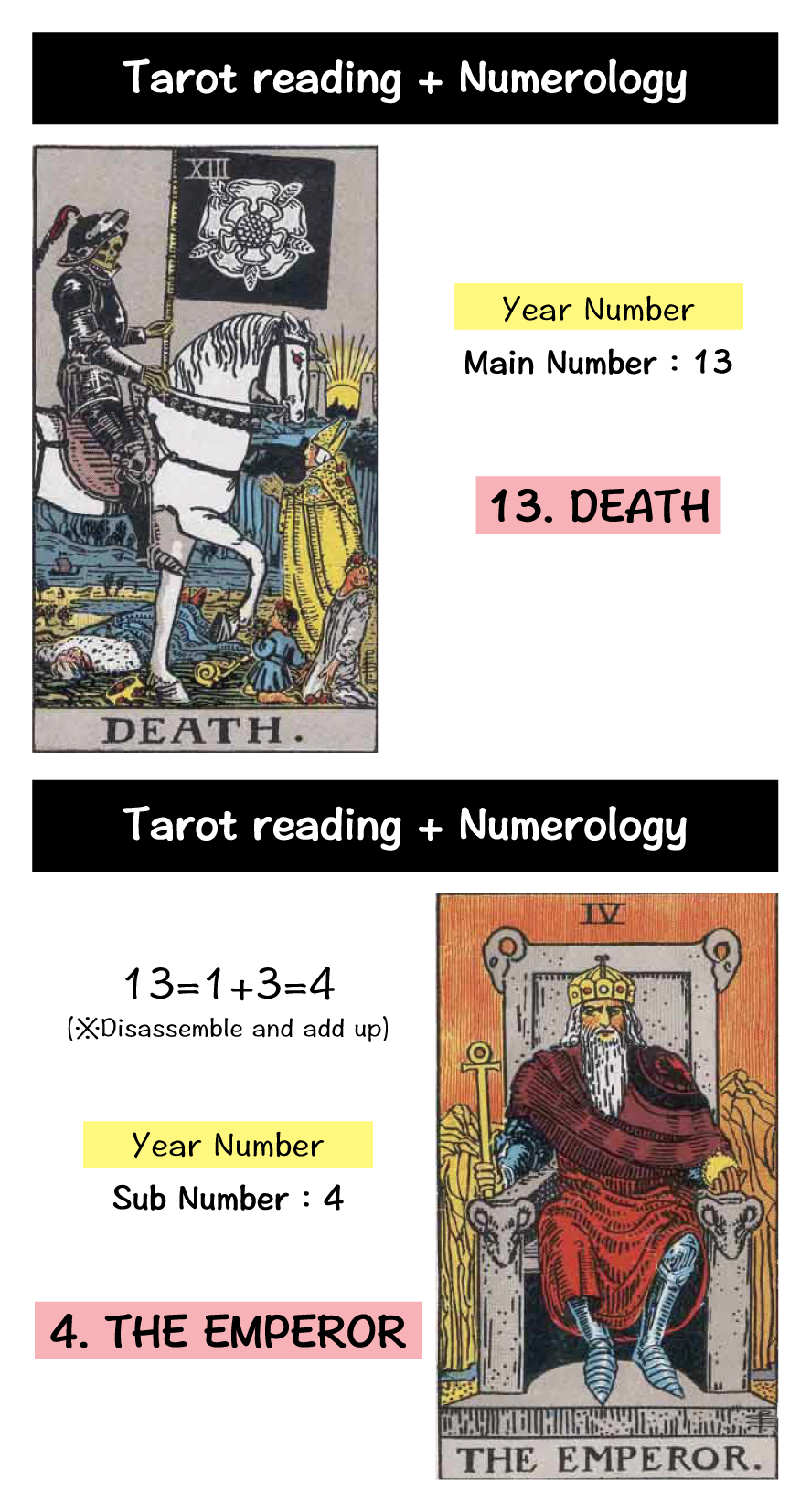 The “13. Death” card represents a year of change and transformation, signifying the end of one phase and the beginning of another. Paired with “4. The Emperor,” which symbolizes building a solid foundation and constructing one’s life, it suggests a year focused on planning and constructing the groundwork for your future.