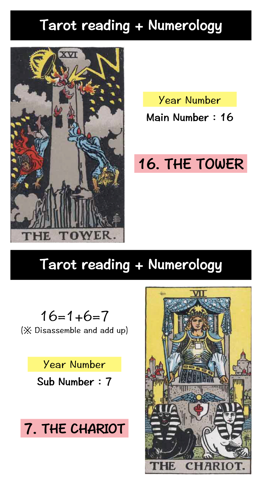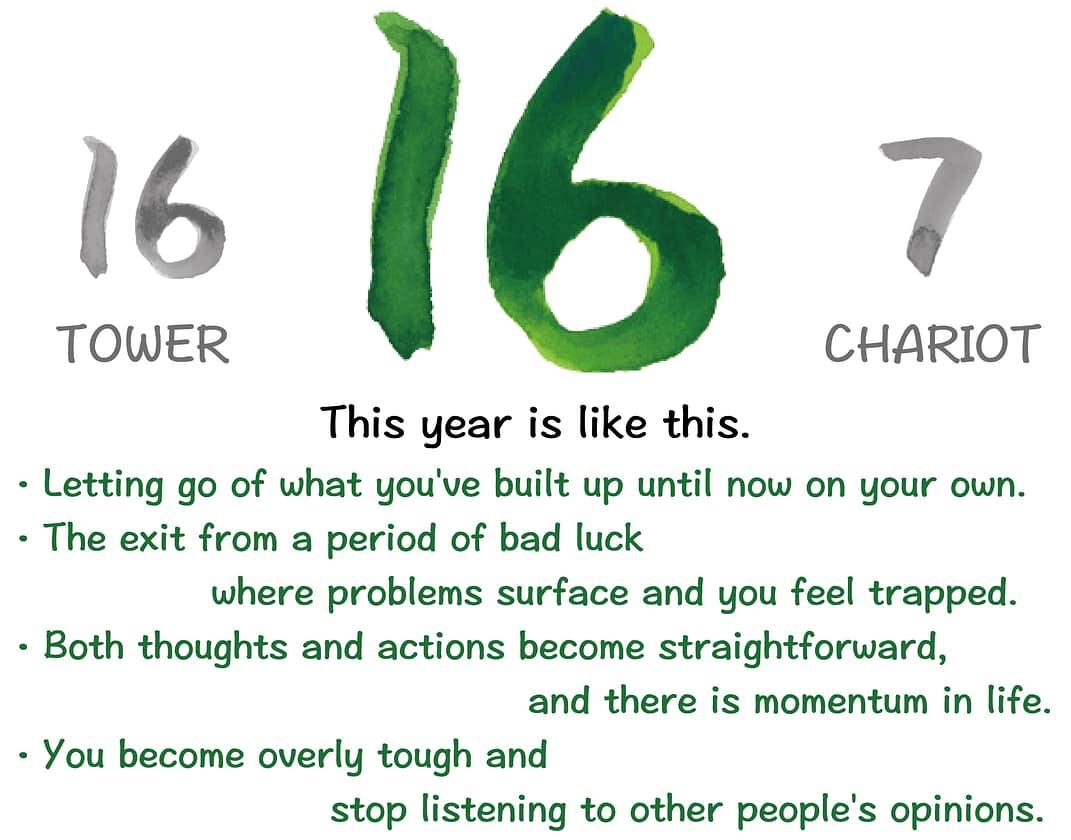The “16. The Tower” card represents the need to clear the past, reset, and embrace change as a means of growth. Paired with “7. The Chariot,” which symbolizes action and moving forward, it suggests a year when your actions can lead to success.