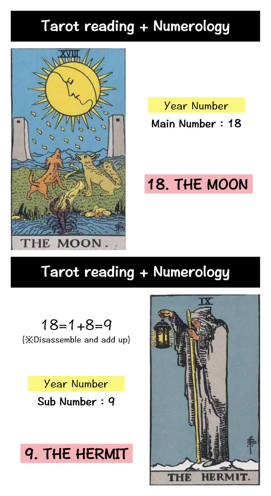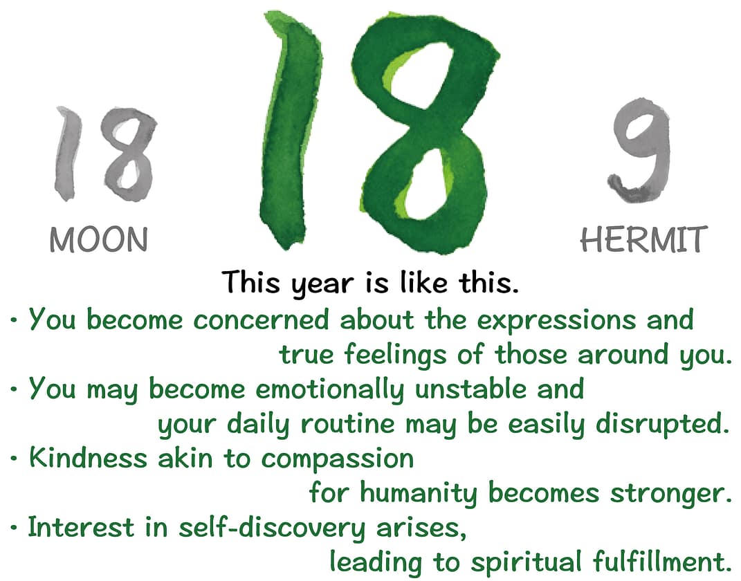 The “18. The Moon” card signifies a year marked by fluctuations in your emotional rhythms and mental changes, making you more susceptible to external influences and somewhat emotionally unstable. Paired with “9. The Hermit,” which represents sharing your experiences with the world and uncovering truths, it suggests a year for sharing your personal experiences.
