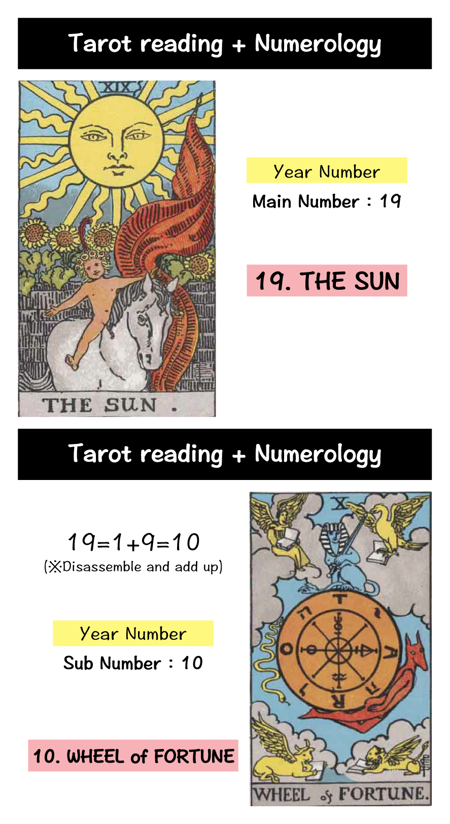 The “19. The Sun” card signifies a year where you can live authentically, things tend to go your way, and you get closer to success and happiness. Paired with “10. The Wheel of Fortune,” which suggests not being overly attached and encountering destiny-driven opportunities, it indicates a year for dynamic changes and the development of new networks.