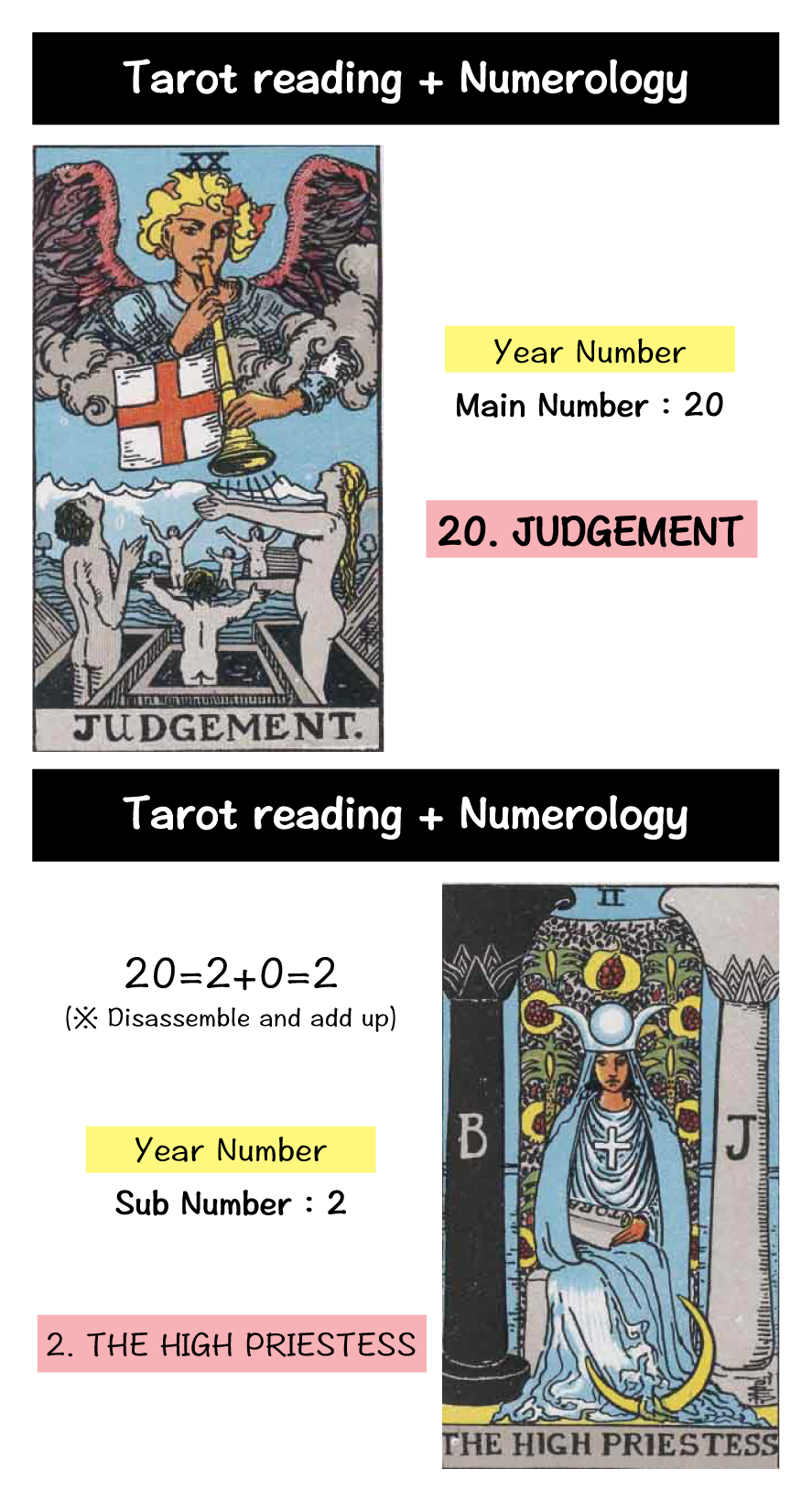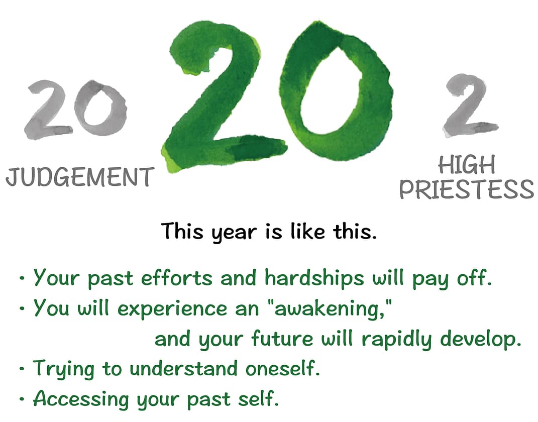 The “20. Judgment” card represents a year of responsibility and awakening, where your past efforts and actions are rewarded. Paired with “2. The High Priestess,” which signifies a calm and heightened subconscious, it suggests a year of self-discovery.