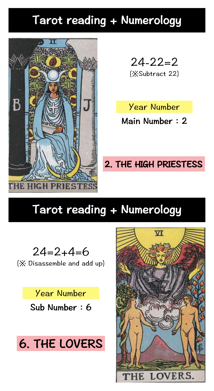 ”The High Priestess” card represents a year of introspection and a heightened awareness of your subconscious. In contrast, “The Lovers” card signifies a year when your senses and playful spirit are vibrant, making you eager to explore what’s enjoyable and intriguing.