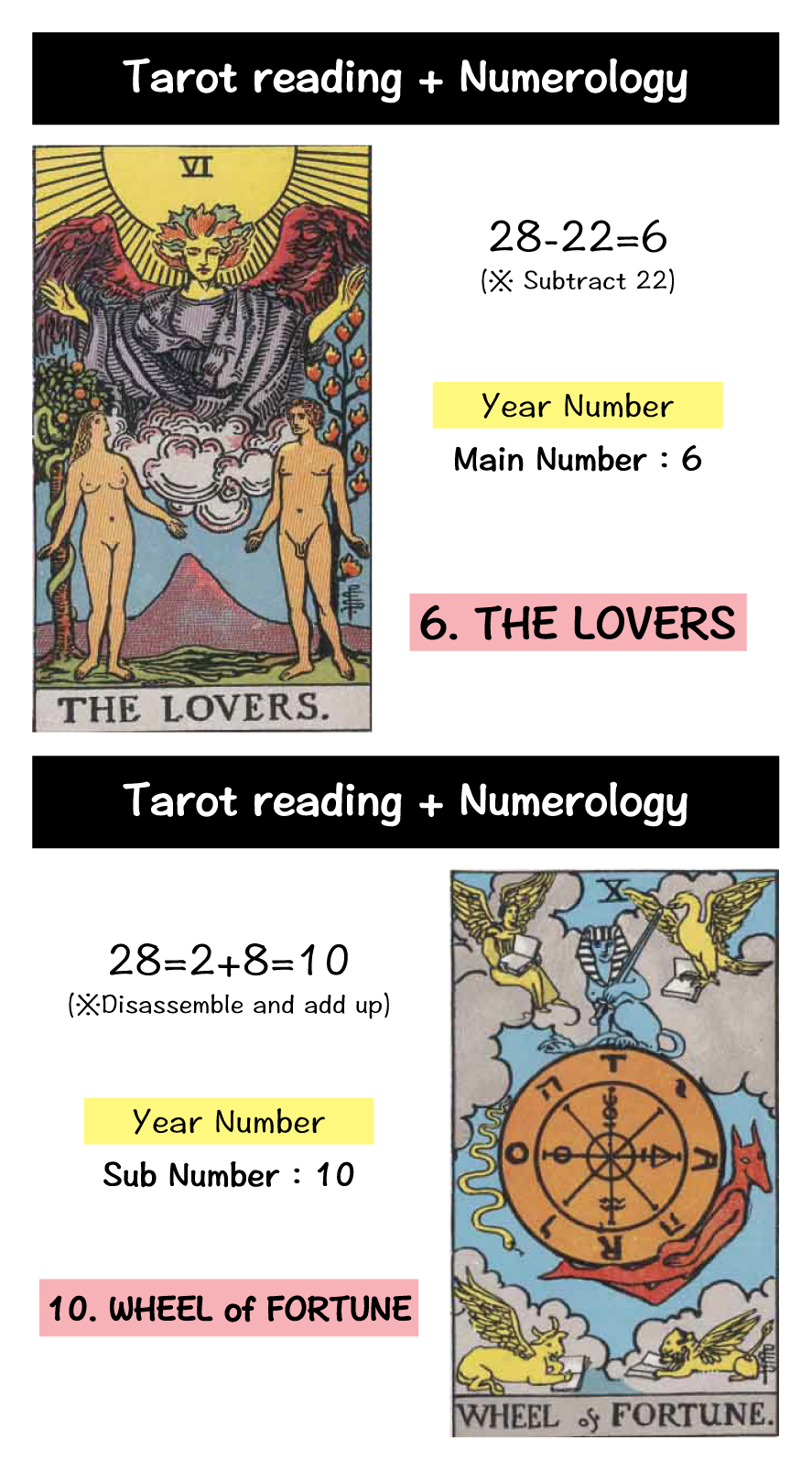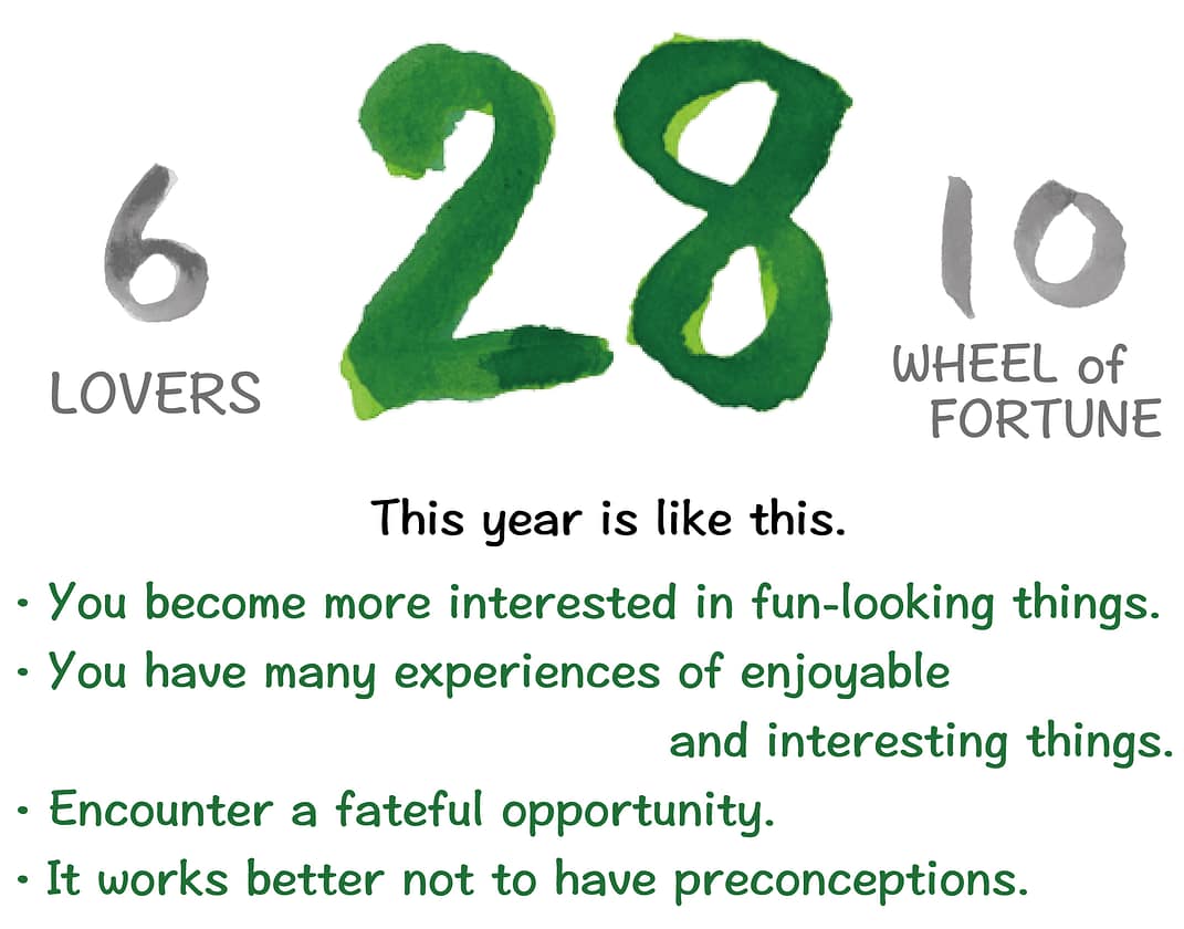 The “6. Lovers” card represents a year characterized by rich sensory experiences and a playful sense of curiosity, making it a year where sensations like “fun” and “interesting” are heightened. The “10. Wheel of Fortune” card, being a card associated with intuition and not holding on too tightly to specific outcomes, signifies a year where you may encounter fateful opportunities.