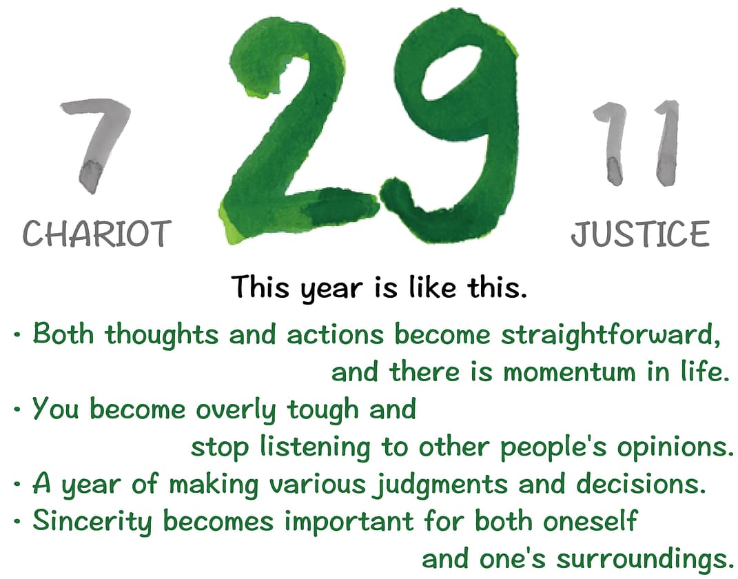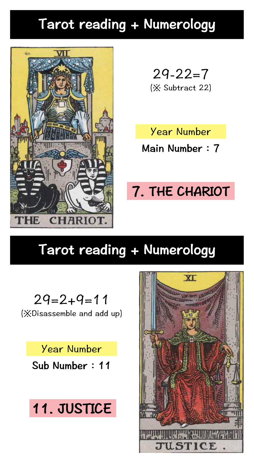 The “7. Chariot” card represents a year of action and progress, signifying a year where you can achieve success through your actions. The “11. Justice” card, being associated with balance and judgment, signifies a year in which you’ll make various judgments to maintain balance in your life.