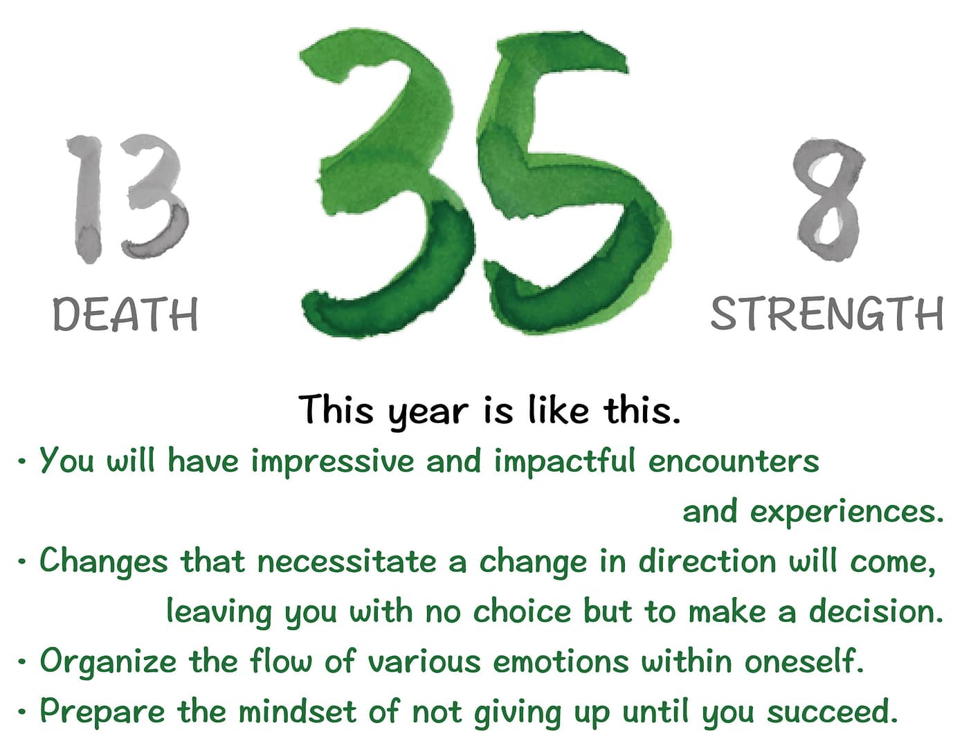 The “13. Death” card represents a year of change and transition, marking a year where you will experience shifts in direction. The “8. Strength” card signifies a year of patiently pursuing ambitious goals that are distant and high, emphasizing the need to balance various emotions.