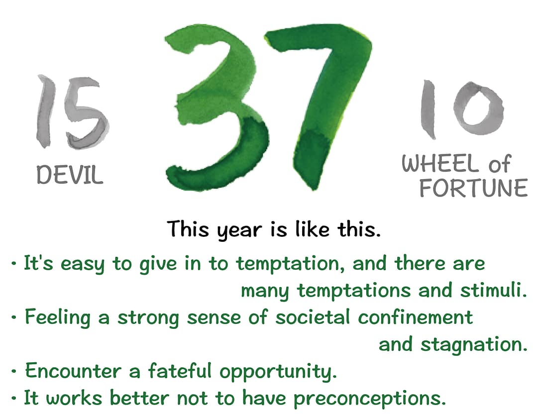 The “15. Devil” card represents a year where your instincts and temptations are heightened, and the “10. Wheel of Fortune” card signifies a year where you encounter fateful opportunities due to its intuitive and non-attached nature.