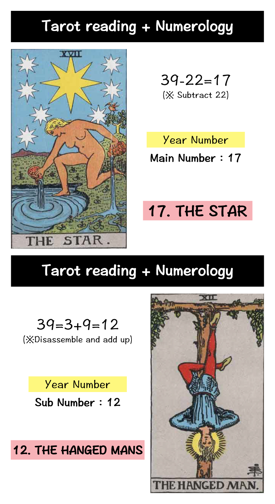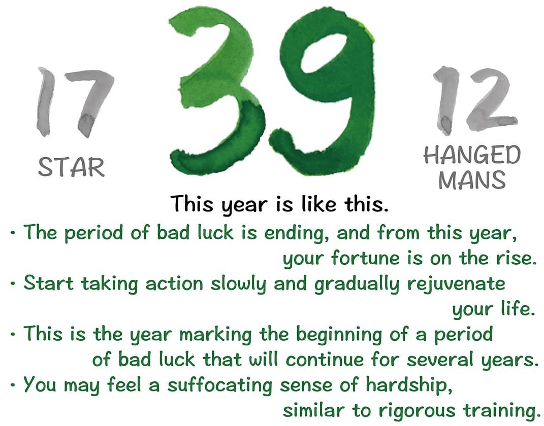The “17. The Star” card represents a year where you guide yourself, seeking new hope to rejuvenate your life. The “12. The Hanged Man” card signifies a year of discipline and effort, where you forcibly control yourself and engage in self-improvement.